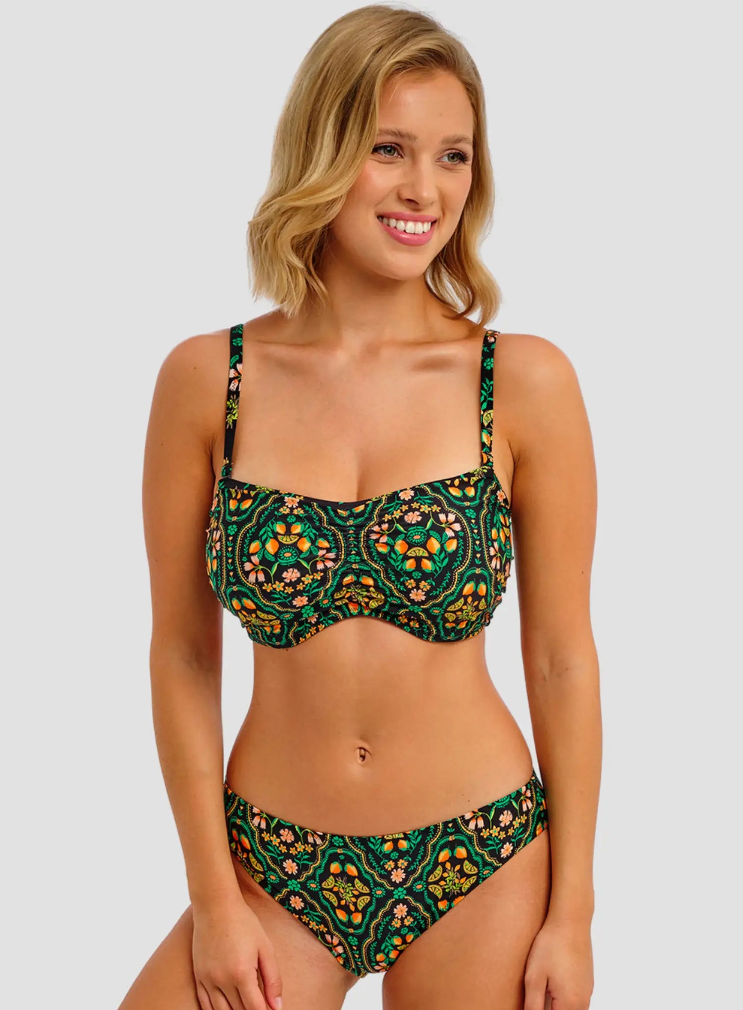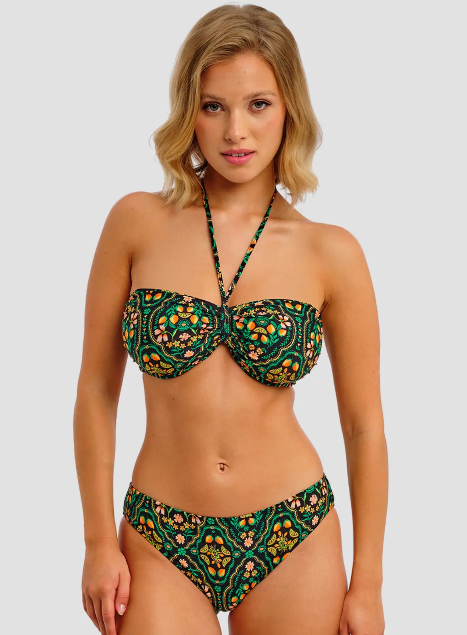 FREYA Sunset in Seville Underwired Bandeau Bikini Top in Santa Ana brings the warmth of Andalusia to your swimwear drawer. Inspired by citrus groves and golden sunsets, this bold print blends vibrant jade and zesty hues on a sleek black base for an effortlessly radiant look.