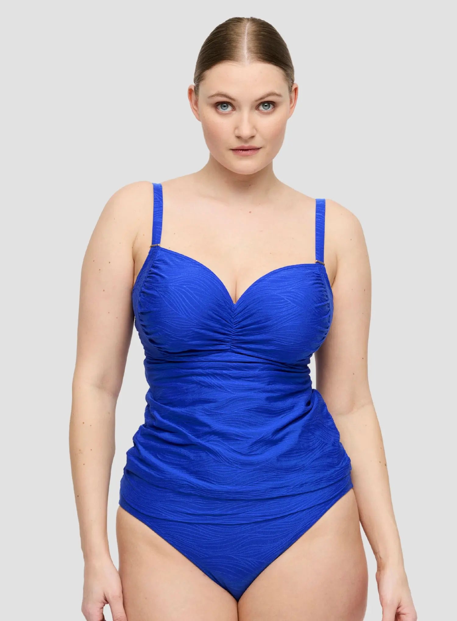PRIMADONNA SWIM Mantas Full Cup Tankini in Electric Blue delivers effortless style and support in one flattering piece. Gathered sides create gentle ruching, while a sweetheart-inspired neckline enhances shape and lift. Full coverage cups with underwire offer reliable support, and multiway adjustable straps allow for a halter or standard fit. The soft wave-textured Belgian fabric is lightweight, easy to wear, and forgiving, making it ideal for all-day comfort.