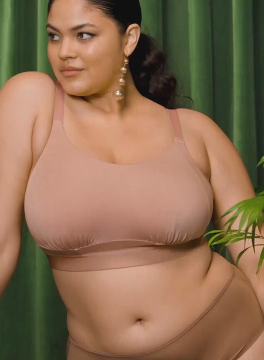 Wide, plush-backed straps and a soft underband keep the bralette comfortably in place, while subtle powermesh side panels provide gentle shaping and forward lift. Minimalist and beautifully soft, this bralette feels like a second skin, making everyday comfort feel luxurious and effortless.
