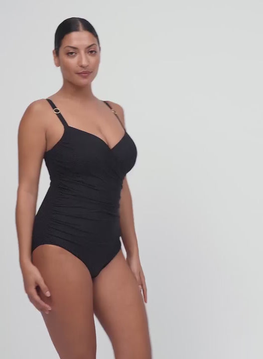 PRIMADONNA Delray Full Cup Control One Piece in Black is a timeless swimsuit designed to flatter every curve. Made from lightly textured fabric, it features figure-shaping panels that smooth and streamline the silhouette for confidence in and out of the water. Draped wrap details across the front add a touch of retro-inspired glamour.