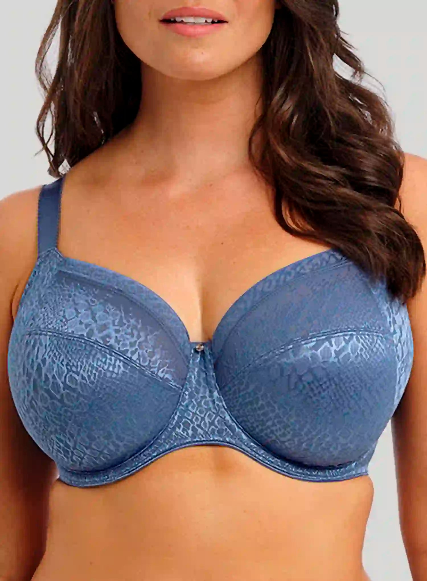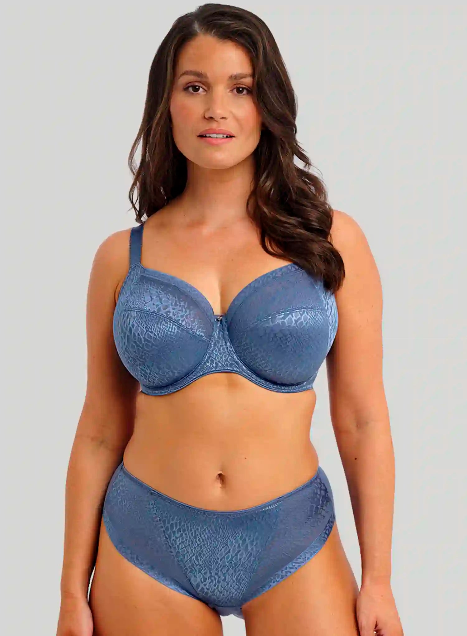 FANTASIE Envisage Underwired Full Cup Side Support Bra in Evening Blue combines signature Fantasie support with a luxe new colourway. Crafted from soft jacquard lace with a subtle animal-inspired pattern and iridescent sheen, this full cup bra is designed for comfort and elegant shaping. Side support panels lift and centre the bust, while the flat lace top cup offers gentle stretch for a seamless, flexible fit.