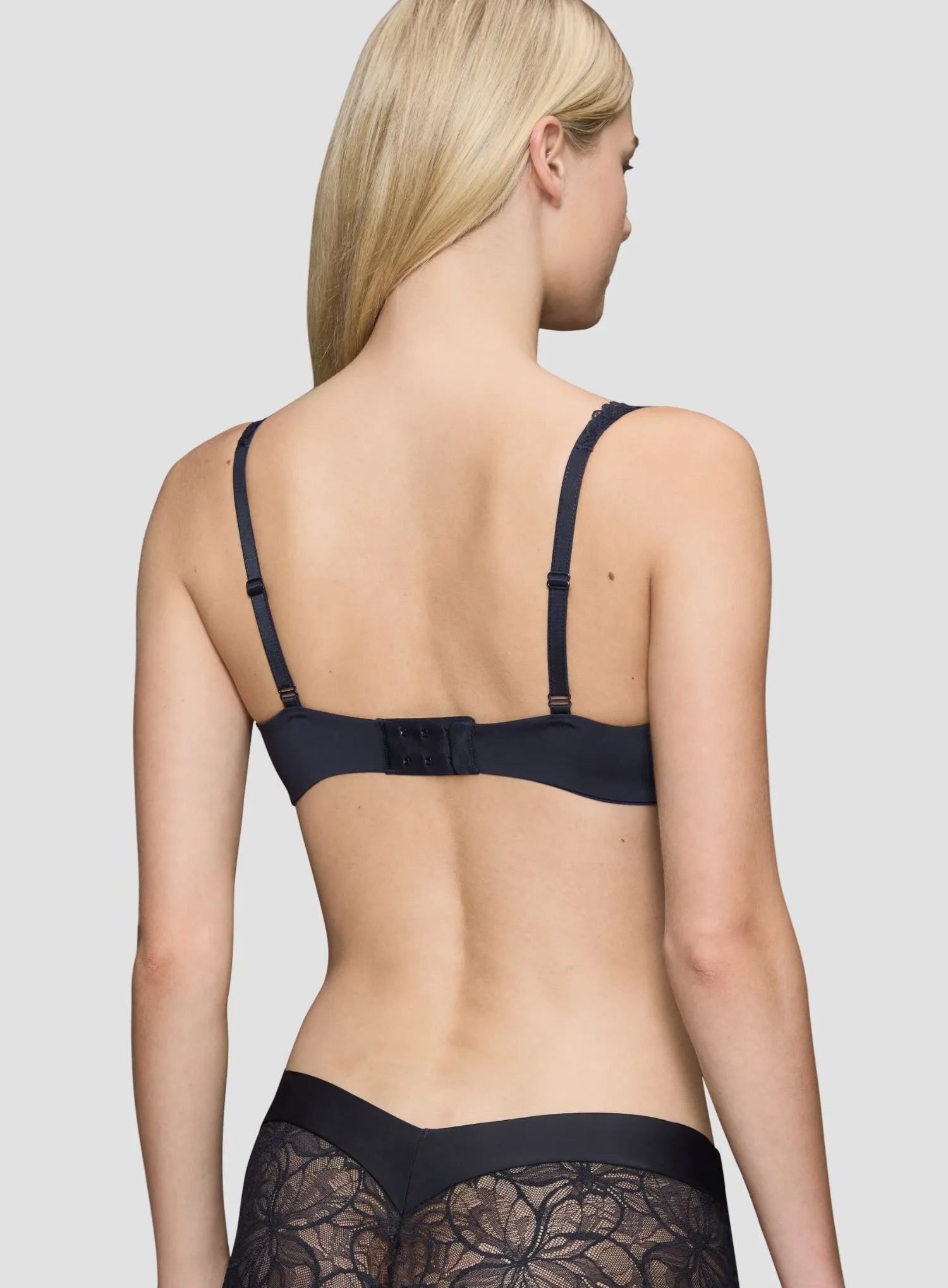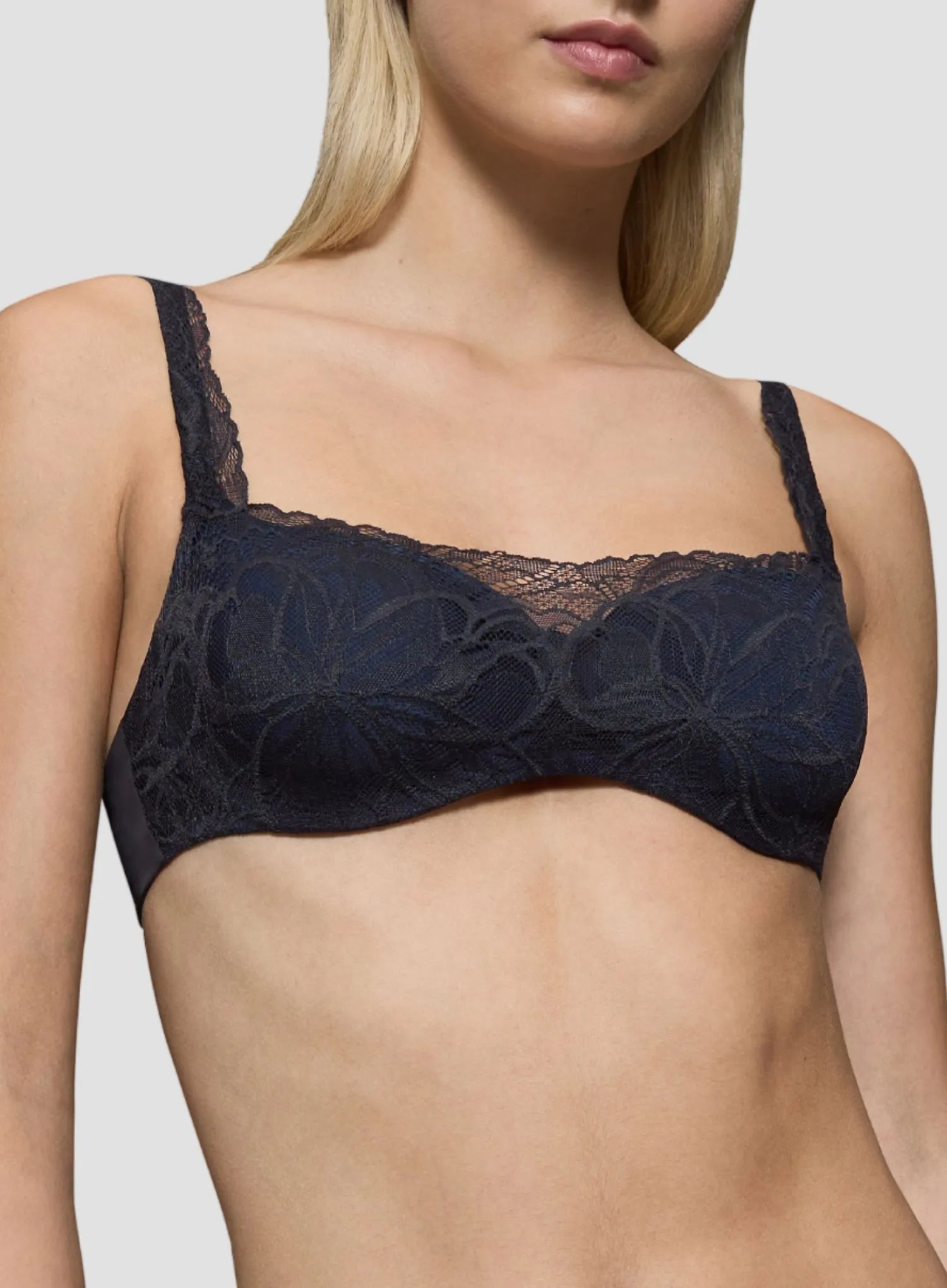 TRIUMPH Body Make-Up Illusion Lace Balconette Bra in Black combines elegance with effortless comfort, designed for women who want support without feeling constrained. The wired, padded balconette shape lifts and shapes the bust beautifully, while flexible, lightweight wires and vanishing cup edges create a barely-there feel. Finished in delicate black lace over navy padding, it adds a subtle two-tone detail that looks as stunning as it feels.
