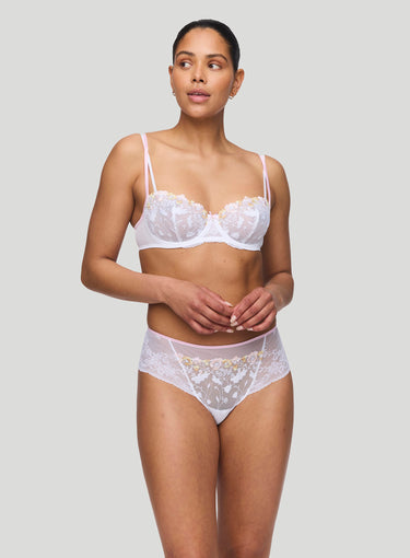 MARIE JO Lizelot Vertical Seam Balcony Bra White was designed with the loyal fan of Marie Jo classics in mind. Matte white embroidery paired with vibrant yarns gives Lizelot a purely romantic look. This non-padded balcony bra is the highlight of this collection, with its low-cut cups, vertical seams and transparent design making for a truly sexy look. Double lined for comfort, the ultra-feminine balcony is super flattering, with its delicate lace detailing and cups that lift and centre for a flirty amount of cleavage.