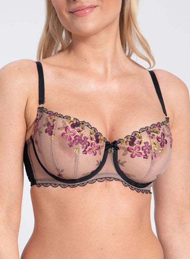 SAMANTA LINGERIE Ramona Soft Half Cup Bra Black brings with it an opportunity to express yourself. Featuring Swiss embroidery in a motif of artistic, colourful flowers, Ramona creates a dreamy tattoo effect on the body. The embroidery features lustrous Soft Lurex threads that are visually pleasing and incredibly gentle on the skin. Crafted from high-weight tulle, the cups perfectly support the bust as well as adapting to the shape of the wearer. The sheer mesh and half-cup shape of the bra works to provide a lighter look for the fuller bust, while also providing amazing cleavage.