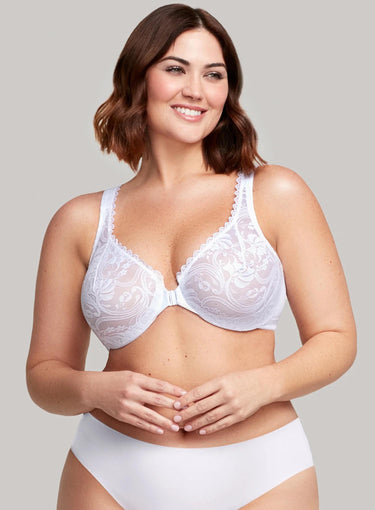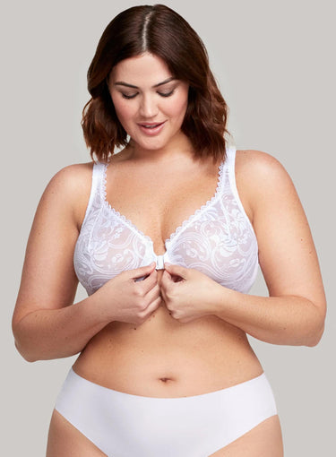 GLAMORISE All Over Lace Front Closing Bra in White combines cute, comfort and convenience all into one! The days of basic looking front closing bras and uncomfortable lace underwire bras are over – now you can have the best of both worlds. The secure front clasp ensures you all the ease in getting your bra on and off, while the Wonderwire technology ensures you get an underwire's support without any discomfort.