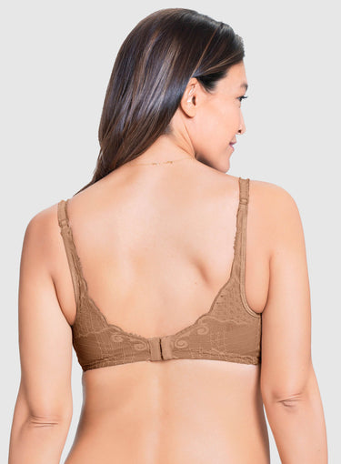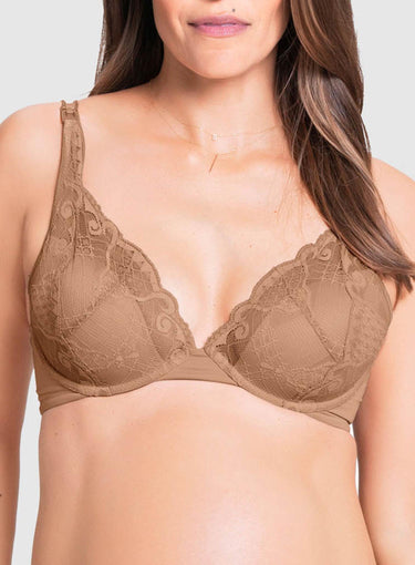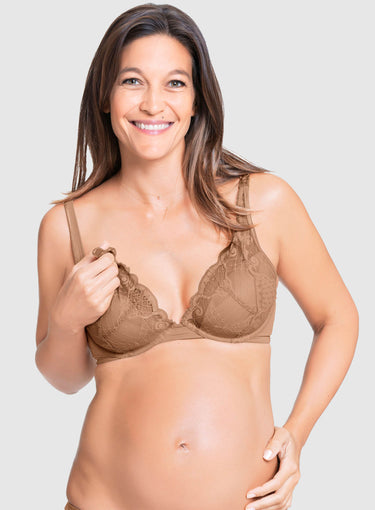 CAKE LINGERIE Truffle Moulded Plunge Maternity Bra features innovative flexible plunge wires. A welcome addition to maternity bras without compromising on fit. This bra offers a 3/4 sexy plunge front with the practicality for everyday wear with its flat engineered lace for t-shirt wear. The cups are lined with brushed cotton creating a very comfortable feel against your skin. This maternity bra offers optimum shape with added side support and a plush sling with easy drop-down cups for feeding.