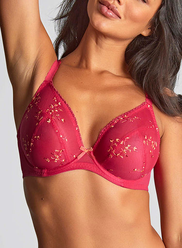 PANACHE Meadow Plunge Bra in Raspberry is a carefully crafted result of passion, style and expertise by Panache. Designed to make you feel amazing, this enchanting new collection will transport you straight to the springtime, featuring embroidery bursting with colour on a bold raspberry mesh base. An extra low centre front makes this one of our deepest plunge styles ever. Rigid bottom cups and lined top cups sit on the cradle, which offers unmatched forward projection and extreme comfort. Finished with pretty trim and strap detailing, this piece is a must have, paired with the Deep Brief or Brazilian Brief.
