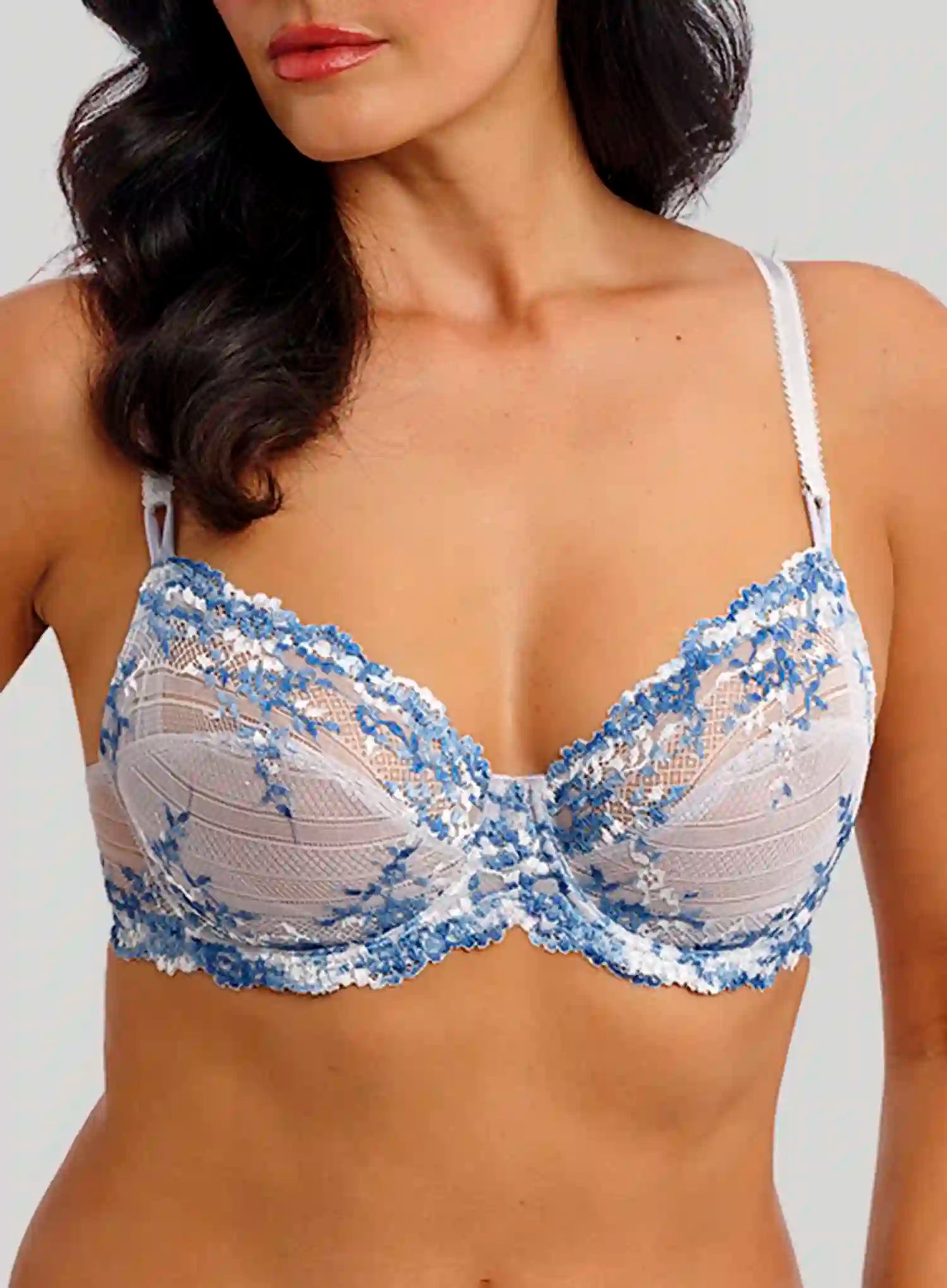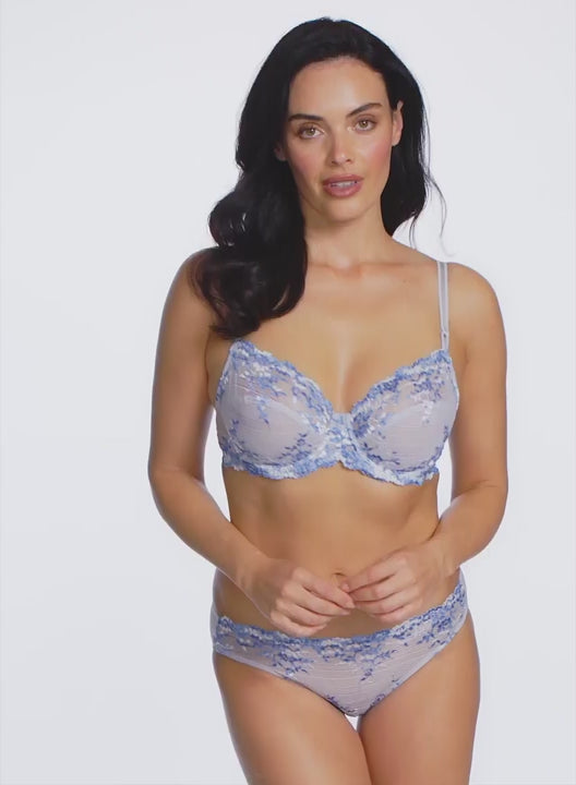 WACOAL Embrace Lace Underwired Bra in Microchip combines signature multi-coloured floral lace with dependable support for everyday wear. The soft blue floral tones on a white ground create a fresh, contrasting look, while all-stretch lace cups and a two-ply mesh back provide shape and comfort. Lining in larger sizes ensures the perfect fit, and adjustable straps give you a personalised lift.