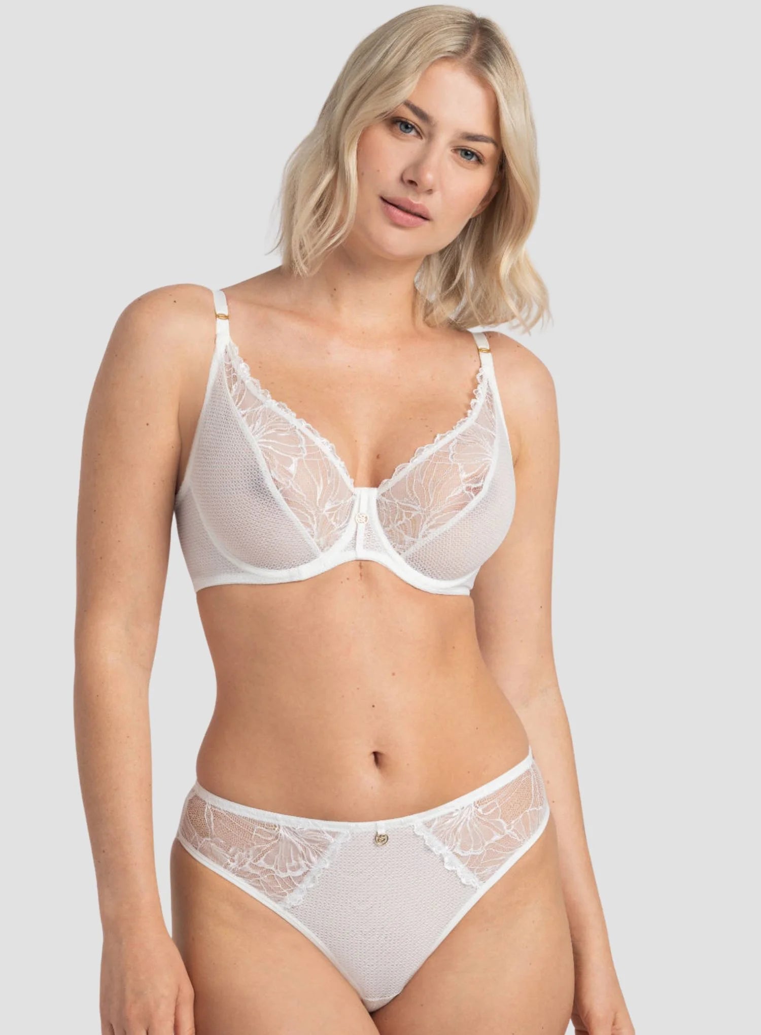 Adjustable straps allow a personalised fit, and the subtly transparent cups are complemented by exquisite golden hardware for a luxe finish. Crafted from high-quality Italian lace in a beautiful cream shade, this bra merges sophistication, style, and comfort, making it perfect for everyday wear or special occasions when you want to feel effortlessly confident.