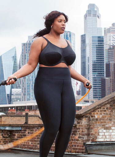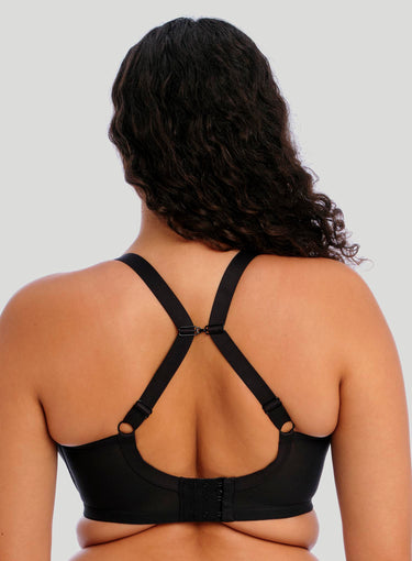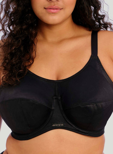 ELOMI Energise Underwired Sports Bra with a J hook for an easy change to racerback.  Perfect for high impact sport with its unique non-compression technology, complete bust separation for shaping and ultimate support. The soft fold-over elastic applied to the under band will minimise chafing. Available permanently to the Energise collection in black.