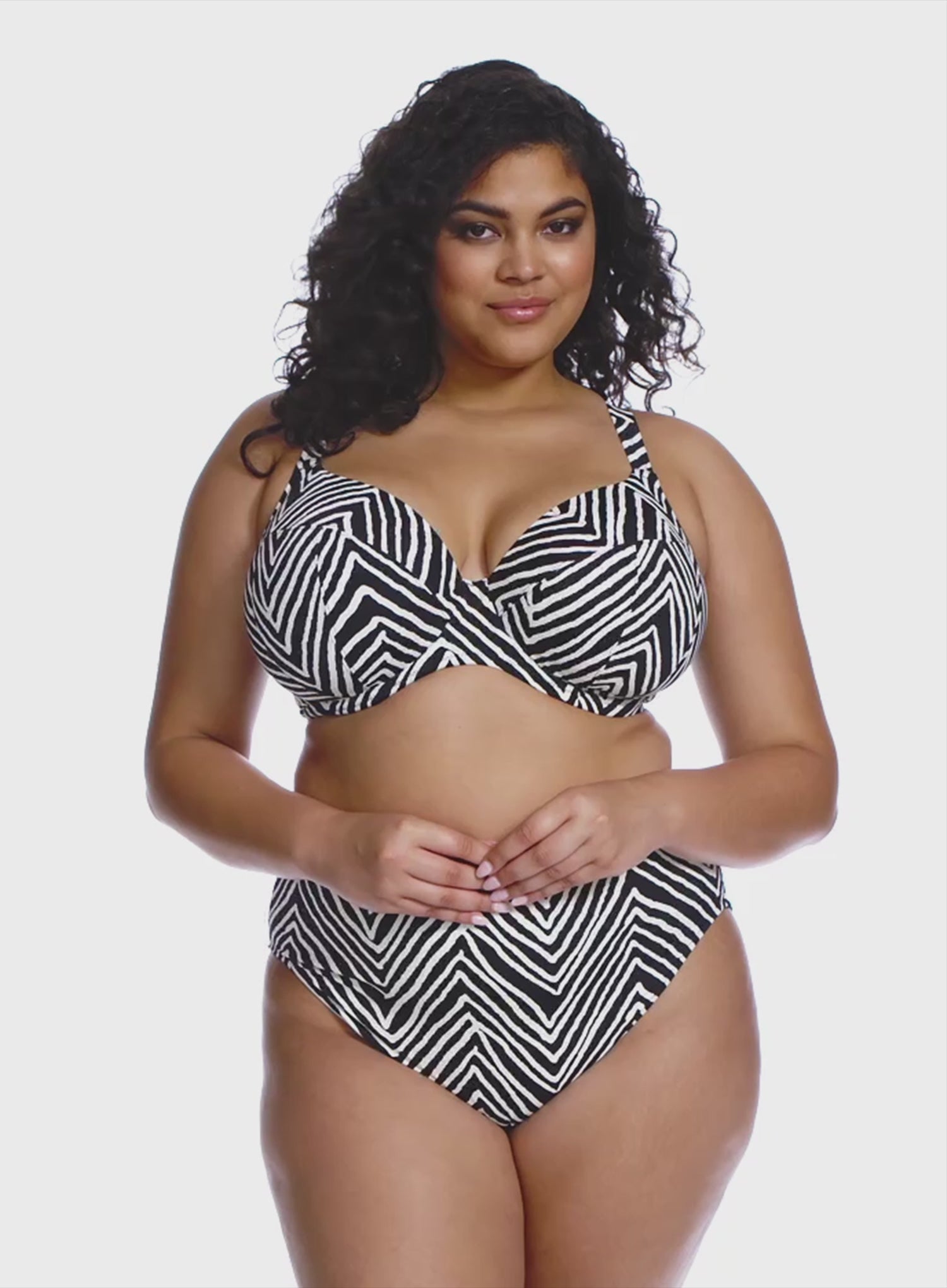 ELOMI SWIM Fiji Falls Underwired Plunge Bikini Top Black is a curve fit essential, combining bold style with Elomi’s signature lingerie-level support. Featuring a striking black zebra-inspired print, this bikini top is based on Elomi’s best-selling plunge bra shape, designed specifically to lift, shape, and flatter fuller busts. The neckline includes concealed elastic for flexibility and comfort, while the cups are fully lined in a light but supportive fabric that offers the look of a bikini with the fit of a bra. Powernet lining through the back provides extra support, and LYCRA® XTRA LIFE™ ensures the fabric stays looking and feeling great wear after wear. Adjustable straps let you customise your fit, making this a standout style for confident summer dressing.