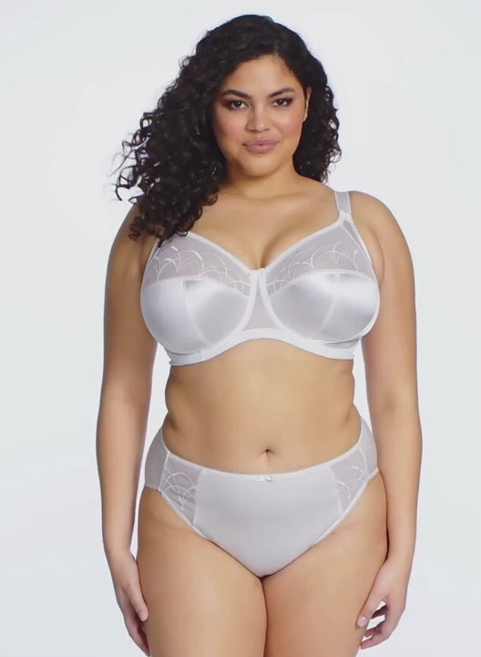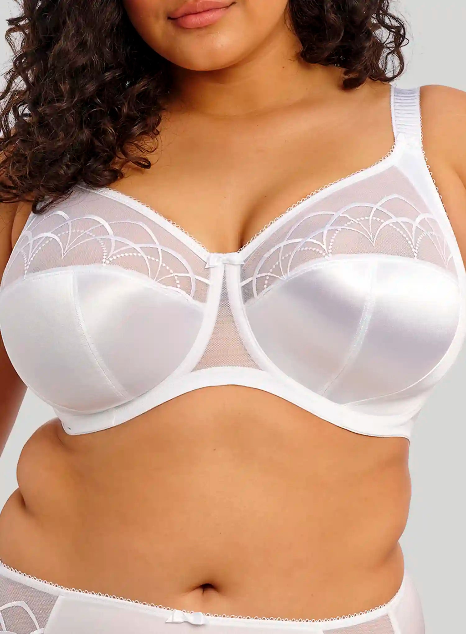 ELOMI Cate Underwire Bra in White is now a permanent colour to the Cate collection! Cate has become a go-to bra for those ladies who have had trouble in the past finding a bra to sit flush against the centre of their chest. The deeper cups allow the breasts to be fully encapsulated, ensuring the bra sits firmly against the body. This combined with the added side support, creates a flattering, forward bust projection. The design features straps set closer to the centre, which reduces the chances of slippage off the shoulders.