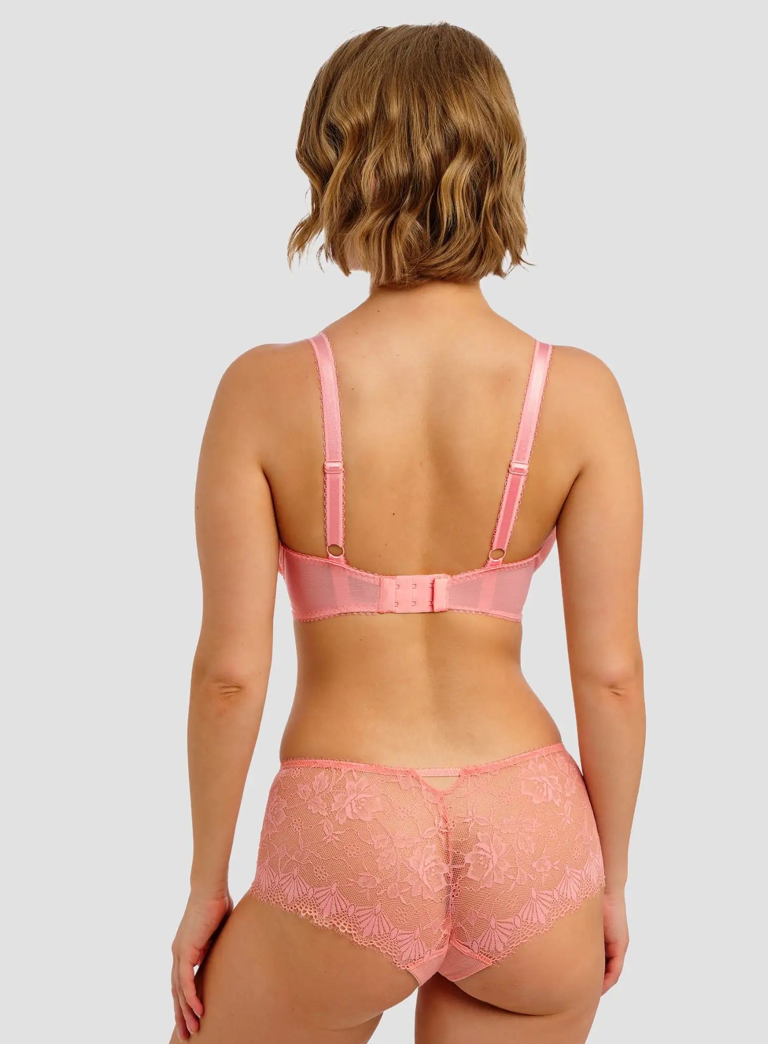 FREYA Fascinate Short in Peach combines soft femininity with practical comfort. Eyelash edge lace decorates the full body of the short, while decorative mesh panels add subtle detailing. The scalloped lace back ensures a smooth, no-visible-line finish, and a keyhole centre-back detail with gold ring and ribbon charm adds a refined touch. Designed to sit comfortably on the hips, it provides coverage with a modern, flattering fit. Romantic, soft, and stylish, this short offers comfort and elegance in a wearable, spring-ready design.