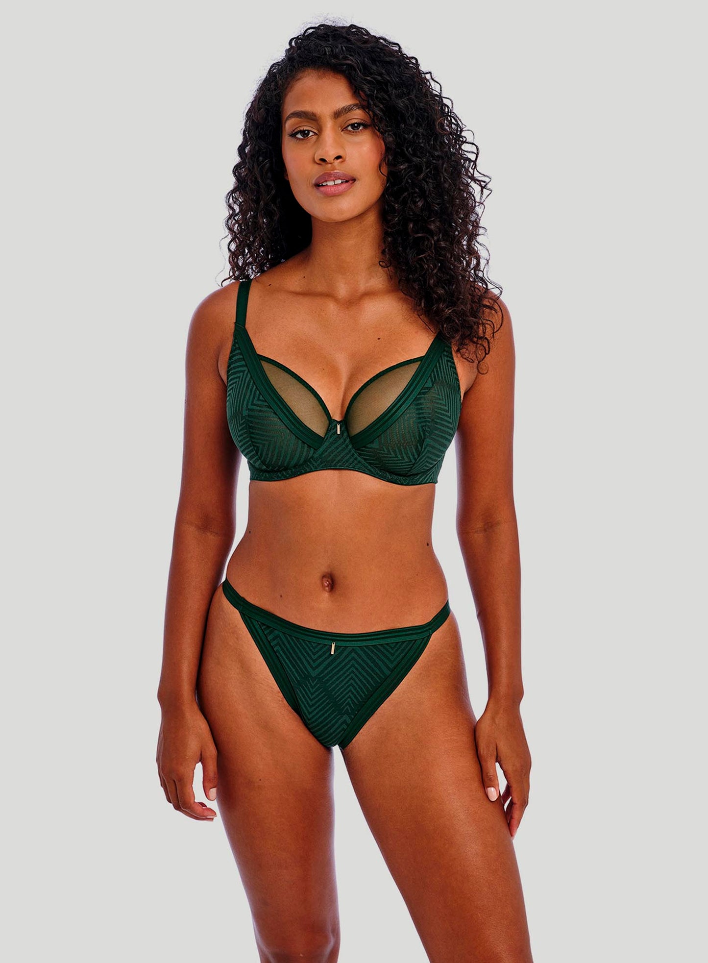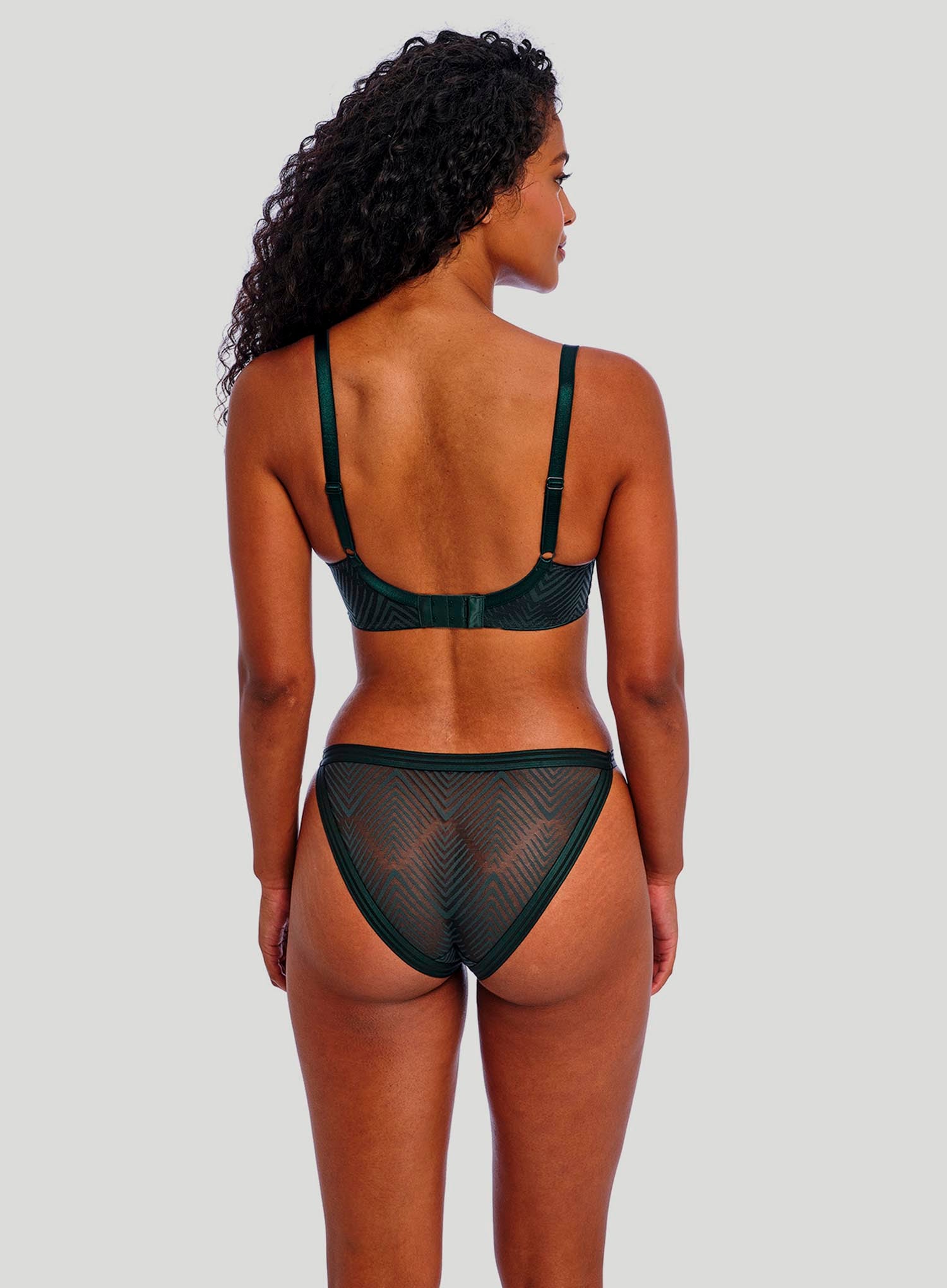 FREYA Tailored Brief in Deep Emerald takes this collection to a whole new level of on-trend styling. Upgrade your lingerie draw today with this geometric lace front and back brief, in a classic mid coverage shape. The passionate deep green hue is accessorised with rose gold trims at the centre front of each garment for a tempting contrast.