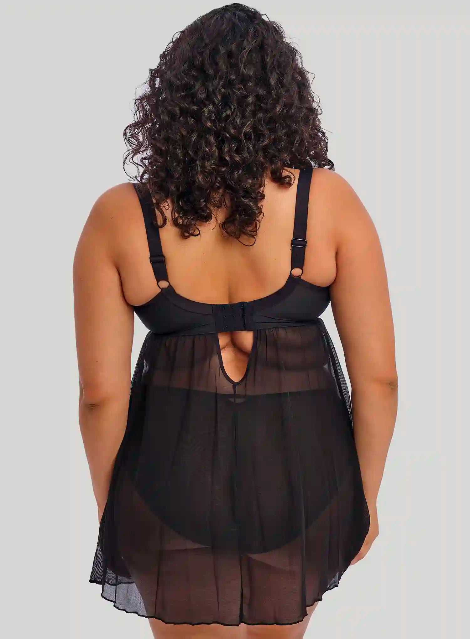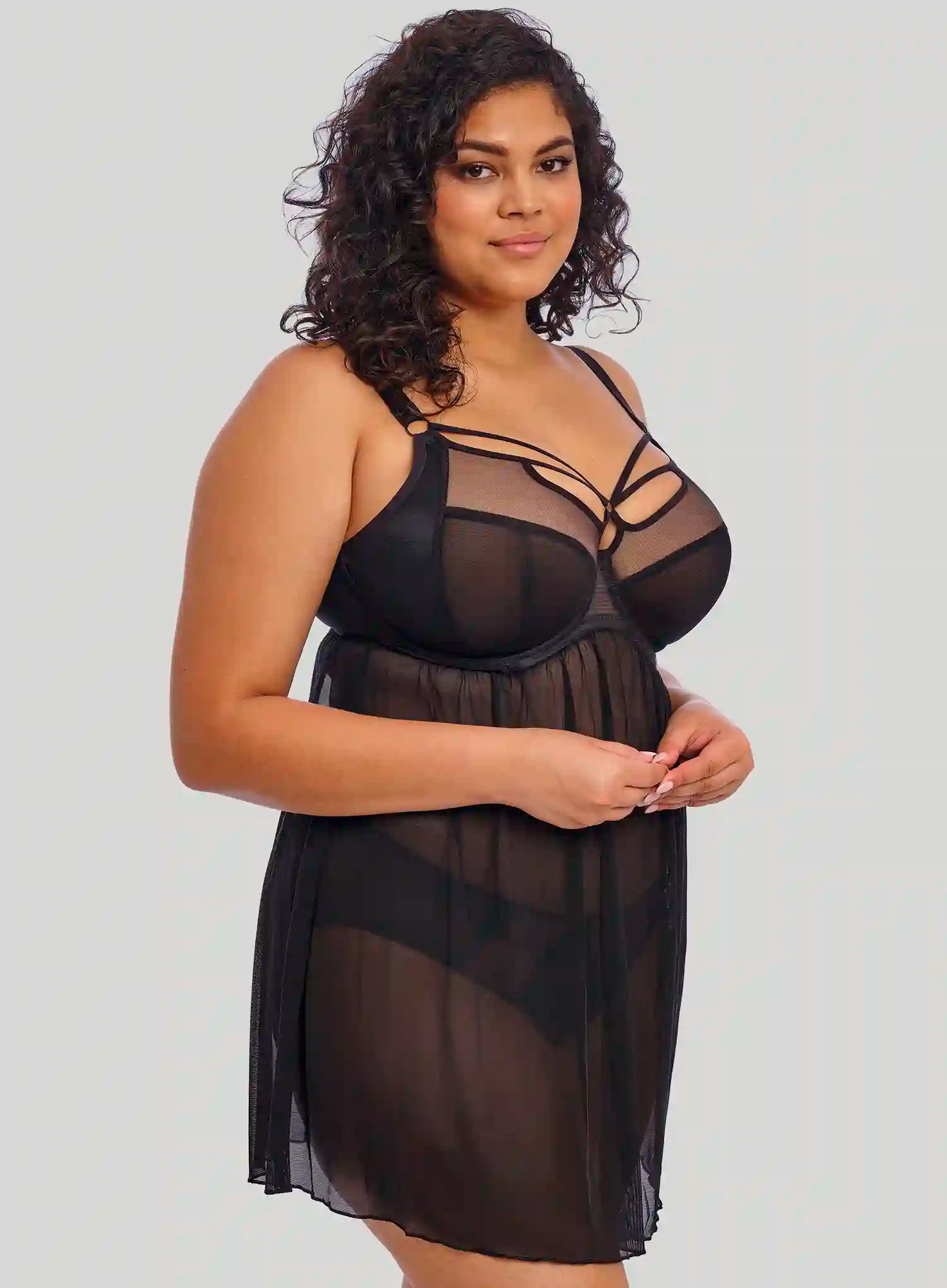 ELOMI Sachi Underwired Babydoll in Black is a permanent addition to the Sachi Collection. Who would have thought something so simple could take centre stage. Comprising of lined tulle cups for a dramatic effect and black strappy cage detail to create a central focal point, the Sachi Babydoll is designed to be shown and emphasise fabulous cleavage.
