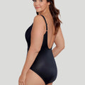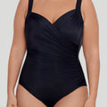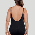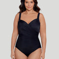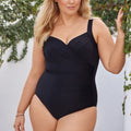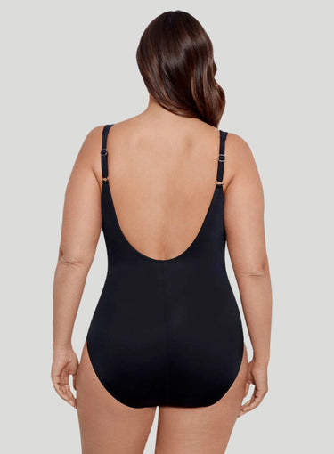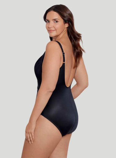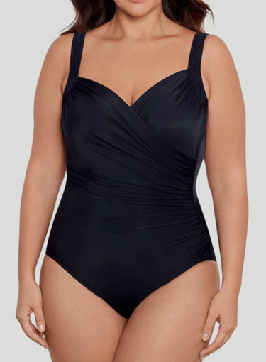 MIRACLESUIT Must Haves Sanibel Underwired Shaping One Piece Plus in Black, a swimsuit designed to offer both style and support. Sensibly shirred from bust to waist, this Miraclesuit Solid Sanibel Swimsuit creates a streamlined silhouette while the thicker, adjustable shoulder straps and low scoop back provide exceptional coverage and comfort. The shapely V-neckline highlights your bust, while the unique torso-wrapping detail adds an eye-catching element. Crafted with LYCRA® XTRA LIFE™ Spandex, it ensures a long-lasting fit that maintains its shape. Designed to captivate, Sanibel is your ultimate slimming secret, effectively streamlining your waist, tummy, and hips.