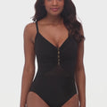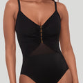 MIRACLESUIT SWIMWEAR Network News Mariposa Underwired Shaping One Piece Black is a chic new addition to the Network collection, known for its sleek mesh panelling and slimming effects. The Mariposa style combines elegance and support, with a flattering ruched bust detail accented by gold hardware for a touch of glamour. Crafted from Miraclesuit's signature Miratex fabric, this swimsuit sculpts and smooths your figure without the need for additional linings. The strategically placed mesh inserts along the midsection enhance the silhouette, creating a subtle hourglass effect. With adjustable straps and full bust support, the Mariposa One Piece ensures you'll feel both confident and comfortable at the beach or poolside.