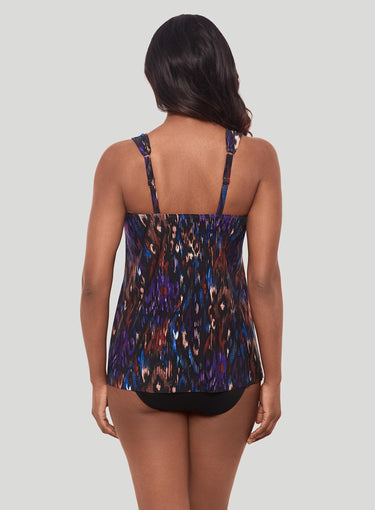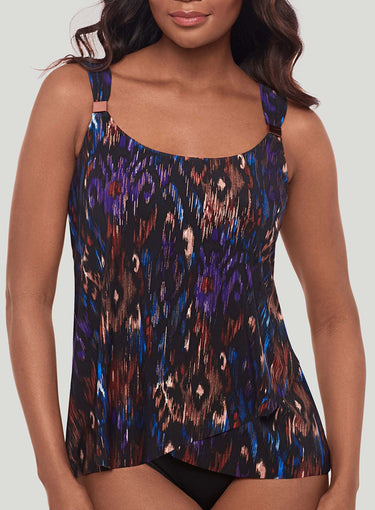 MIRACLESUIT SWIMWEAR Tapiz Dazzle Underwired Tankini Top Black Multi will flatter your figure instantly! Made with patented Miratex fabric, this tankini helps you look up to 10 lbs lighter in just seconds. The expertly designed draping across the tummy area creates a slimming effect, while the scoop neckline and adjustable straps offer a perfect fit and customizable lift. Stylish hardware details on the straps add a chic accent. The vibrant print blends rich hues of purple, blue, and earthy browns, creating a striking, abstract pattern that adds a touch of sophistication to your swimwear collection.