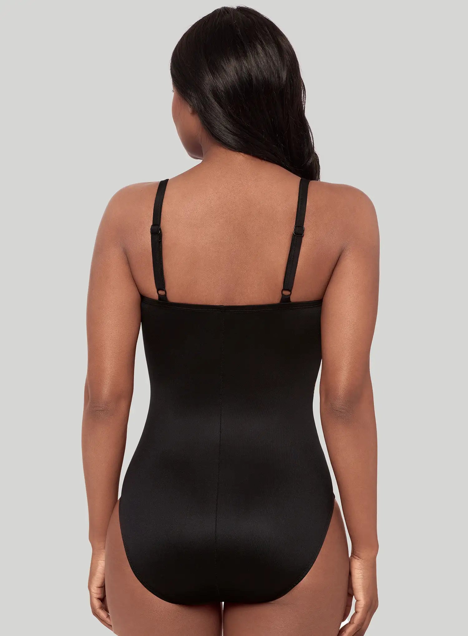 MIRACLESUIT Boca Grande One Piece in Black Multi sculpts and supports with hidden underwire and clever starburst pleating that draws the eye to the waist. The curved square neckline accentuates the bust, while adjustable straps allow you to find your perfect fit. Beneath the surface, signature Miratex fabric provides all-over shaping power, smoothing your silhouette with ease and comfort.