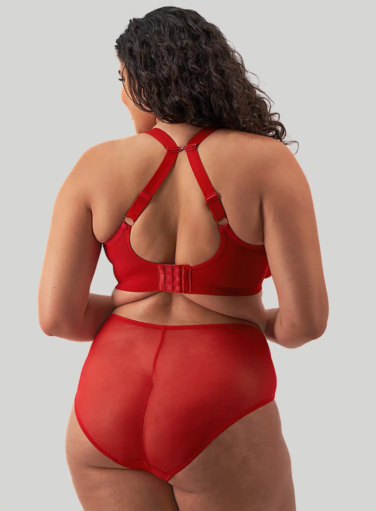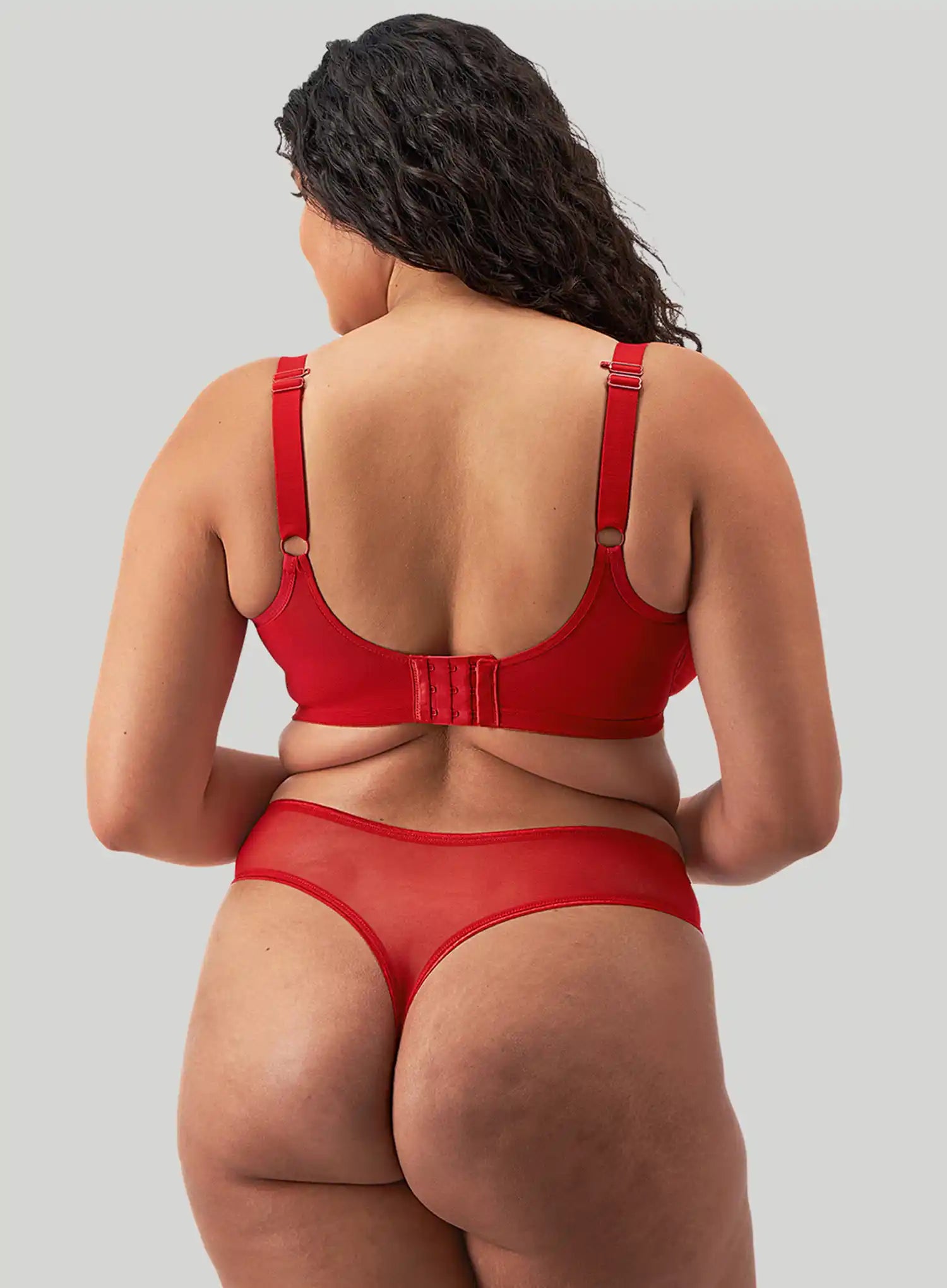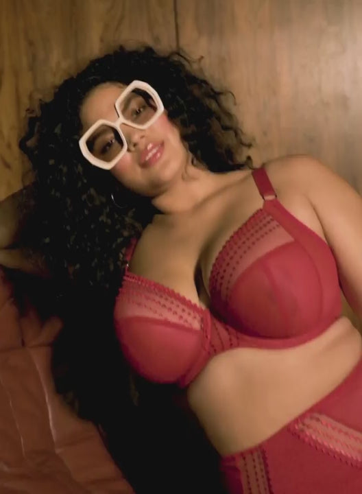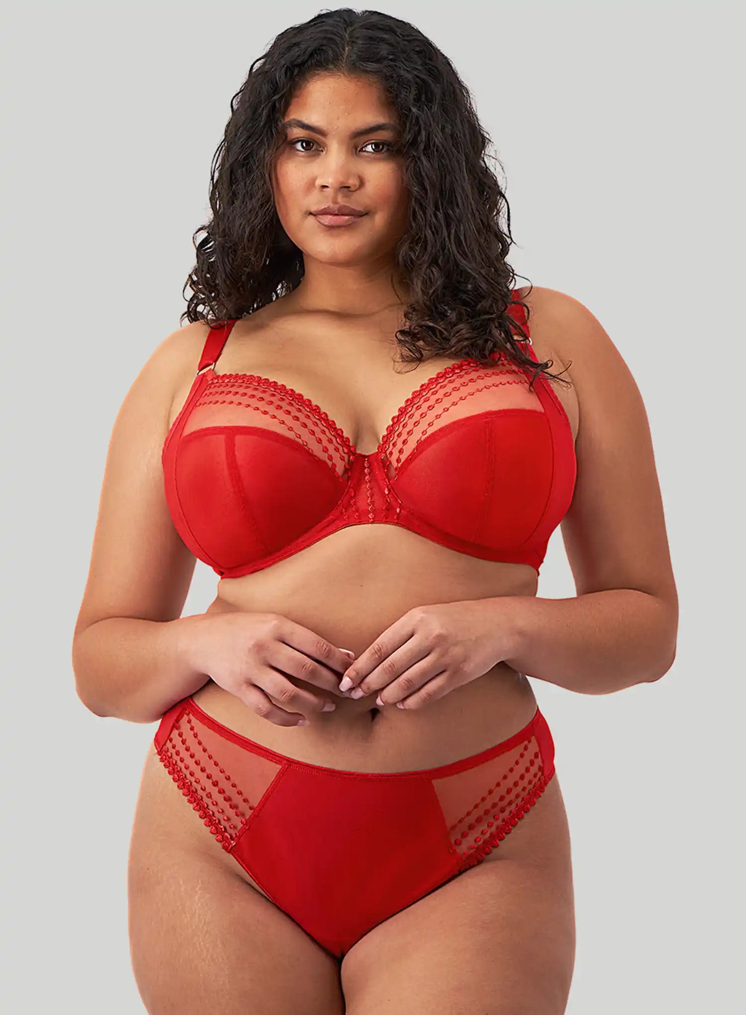 ELOMI Matilda Plunge Bra Haute Red, the signature style returns in the perfect hue to accentuate the collection’s true beauty. This latest edition includes the showstopping Matilda embroidery, giving it a light and alluring look and feel. Giving the perfect amount of cleavage without excess lift, all while being completely soft to touch. An elasticated neck edge, adjustable straps, and a moveable J-Hook are all what make this style completely customisable to you. No season would be complete without the return of the DeBra’s fitter and customer favourite alike.