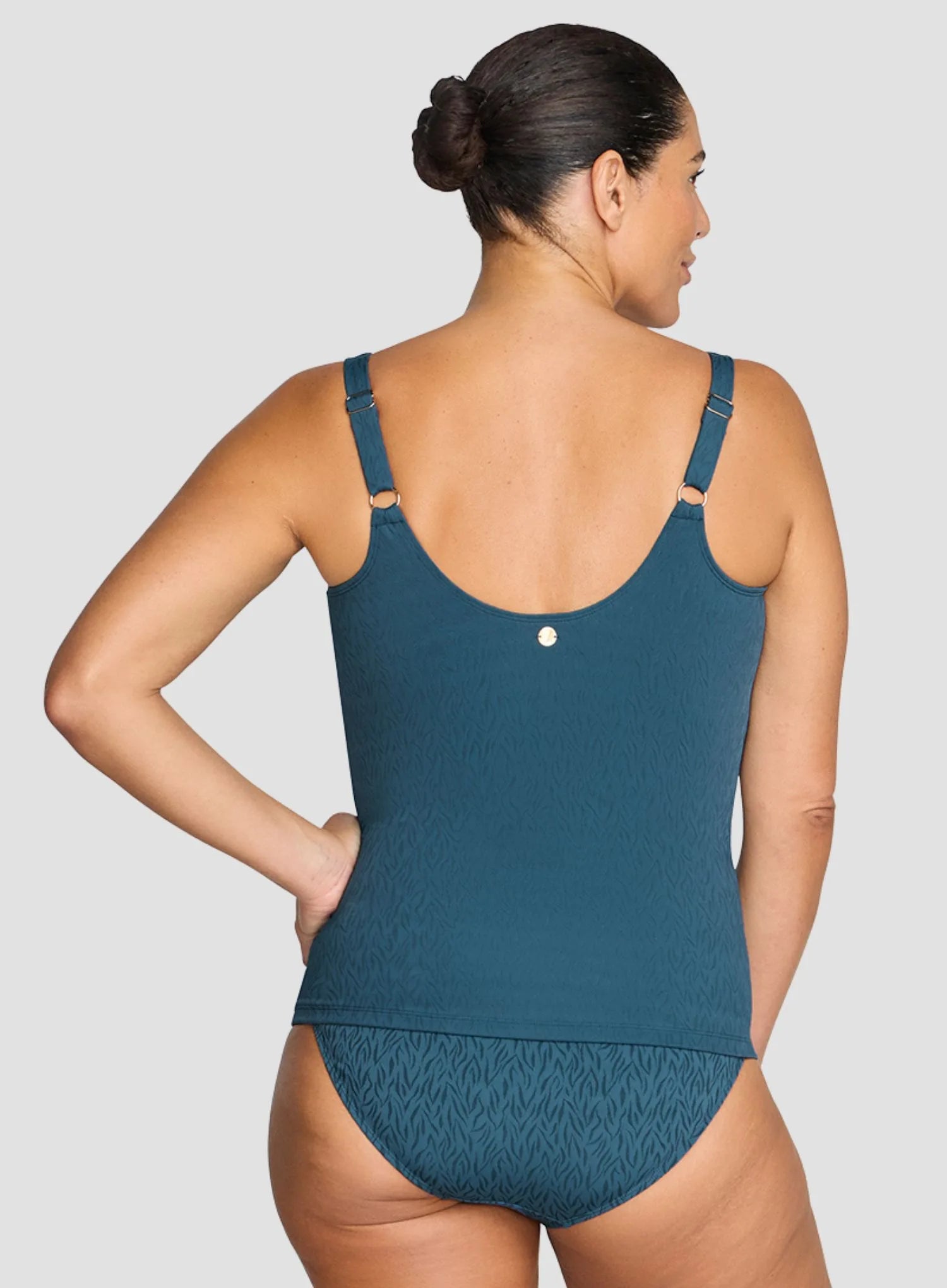 ARTESANDS Minque Delacroix Cross Front Tankini Top in Dark Slate is designed to flatter and support curves effortlessly. Its elegant jacquard pattern adds subtle texture, while the crossover front enhances the bust and creates a chic, modern silhouette.