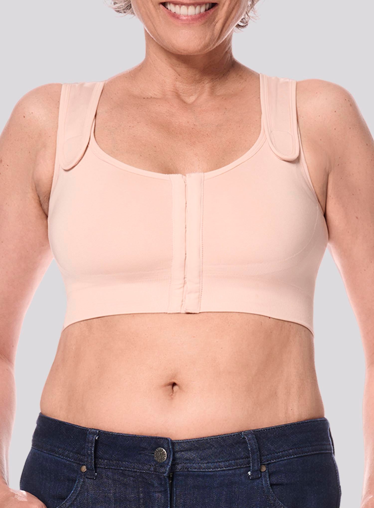 AMOENA Sina Post-Surgery Seamless Compression Bra Rose Nude is a medium-compression solution designed for immediate post-surgical care. Pre-washed and clinically packaged, it combines hygiene with convenience. Seamless technology and anatomically shaped, stretchable material ensure an accurate, adaptive fit tailored to individual breast shapes and sizes. Special knitting zones provide targeted support for immobilization and stabilization, while the hook-and-eye front closure allows for effortless dressing and surgical site access. Adjustable wide straps and compatibility with a compression belt make the Sina Bra an essential recovery companion, offering optimal comfort and reliable compression.