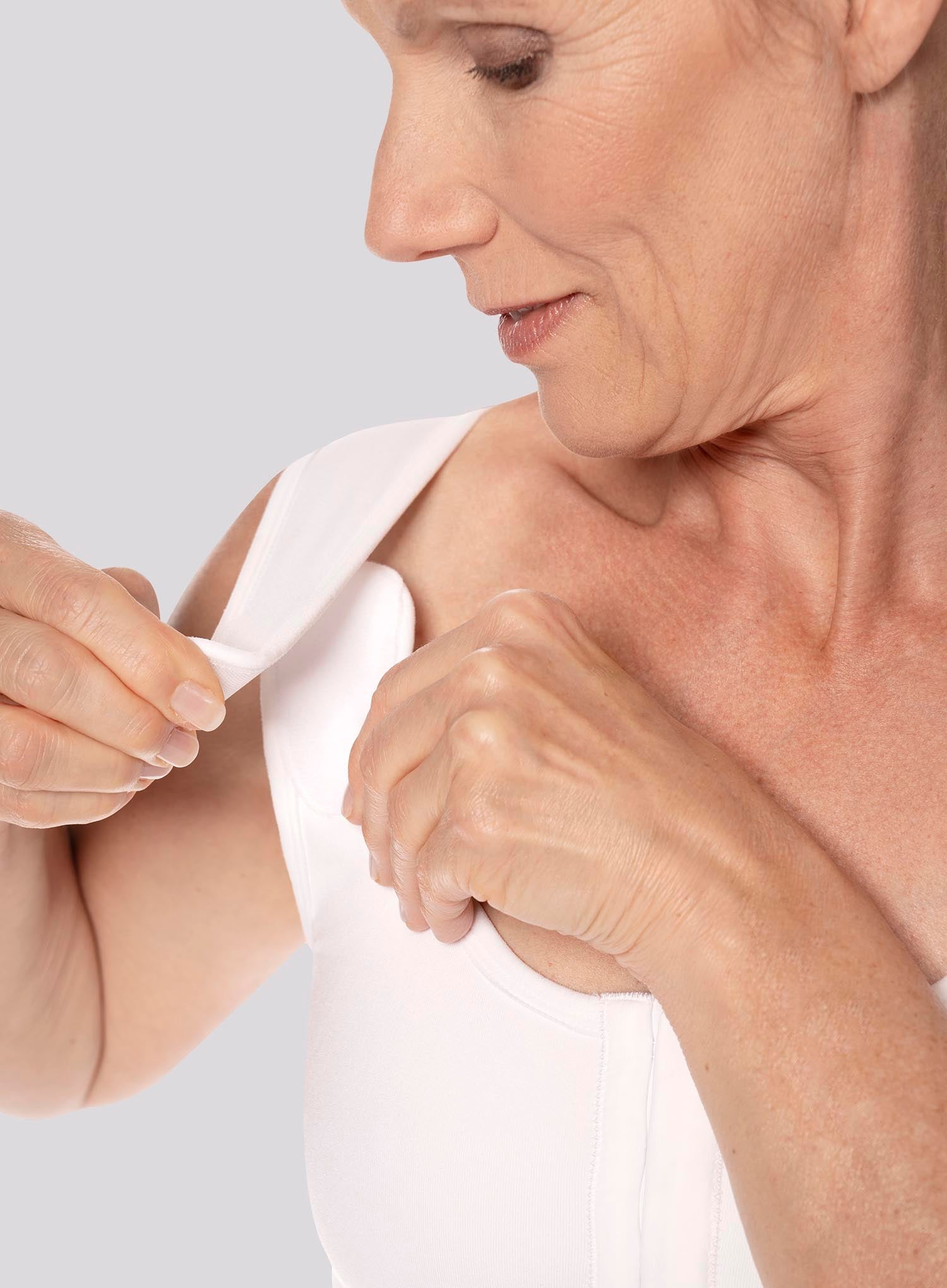 - Specialized knitting zones in the lower cup for immobilization and stabilization of the operated breast
