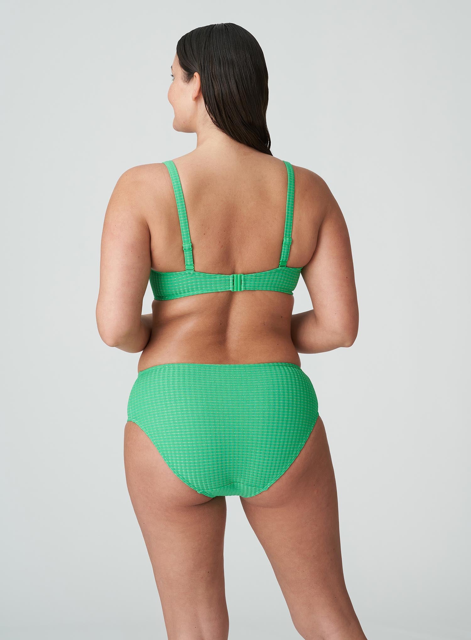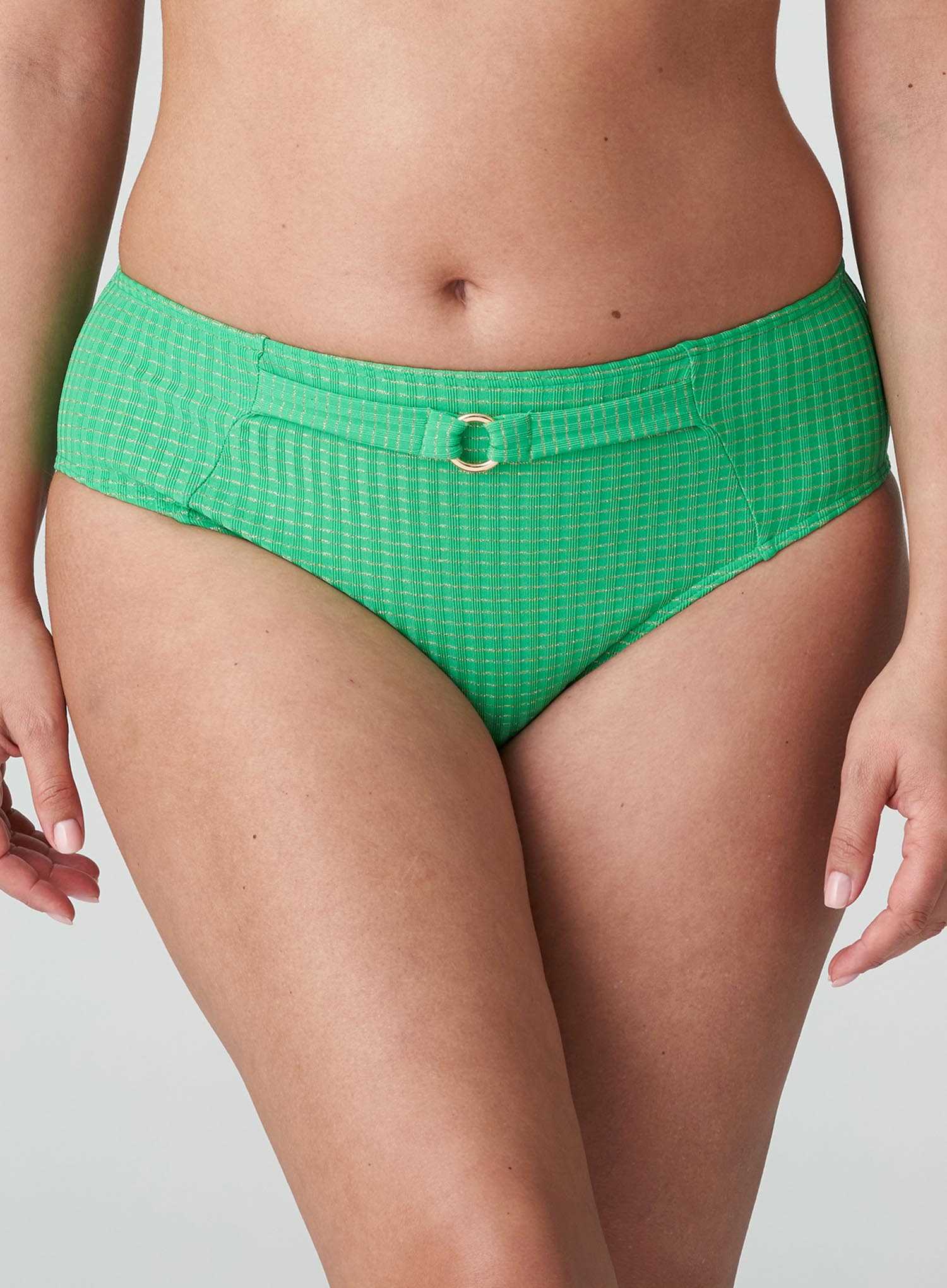 PRIMADONNA SWIMWEAR Maringa Full Bikini Brief in Lush Green celebrates sporty swimwear with its intense hues and retro flair. The high waistline comfortably controls your tummy, while the striped fabric looks sporty and flattering. Subtle glitter woven through the fabric, and gold hardware light up in the sun and give this collection a luxurious touch. A simple yet stylish design that is sure to make a splash!