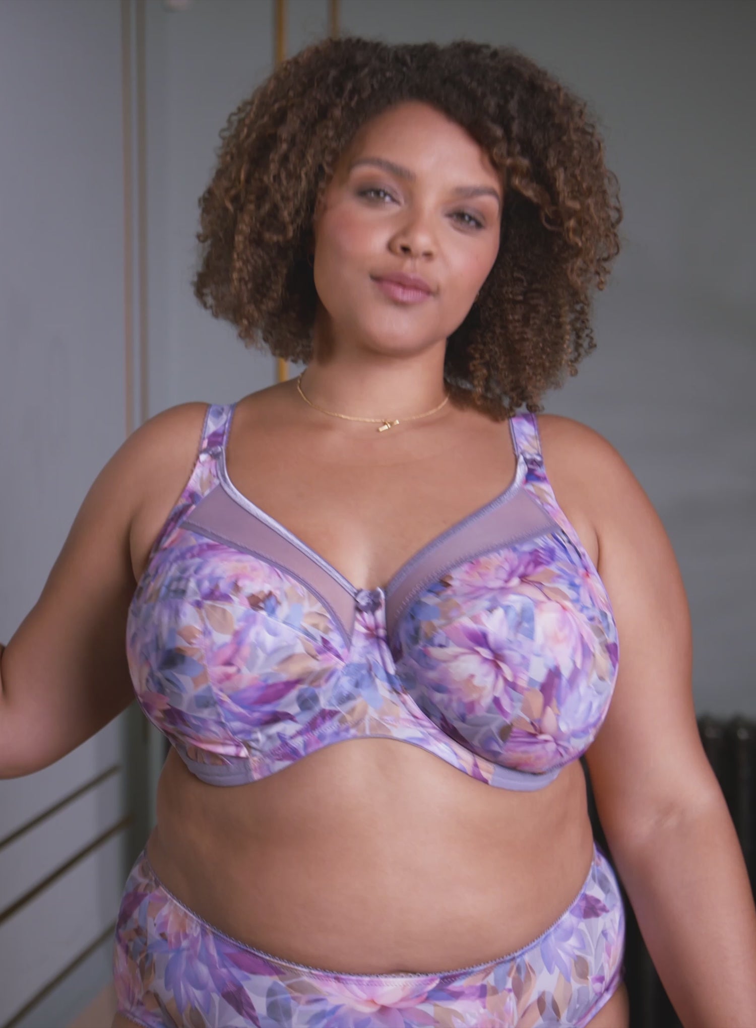 GODDESS Kayla Brief Lotus design showcases a captivating, dreamlike floral arrangement with layers of pink and purple blooms set against a soft, dusky grey backdrop. DeBra’s expert Fitting Consultants love adding a touch of boldness to the fitting room, and the Kayla Brief delivers just that—a seamless blend of eye-catching fashion and unparalleled comfort. Whether you're looking to make a statement or simply embrace everyday elegance, the Kayla Brief is your go-to for effortless style and support.