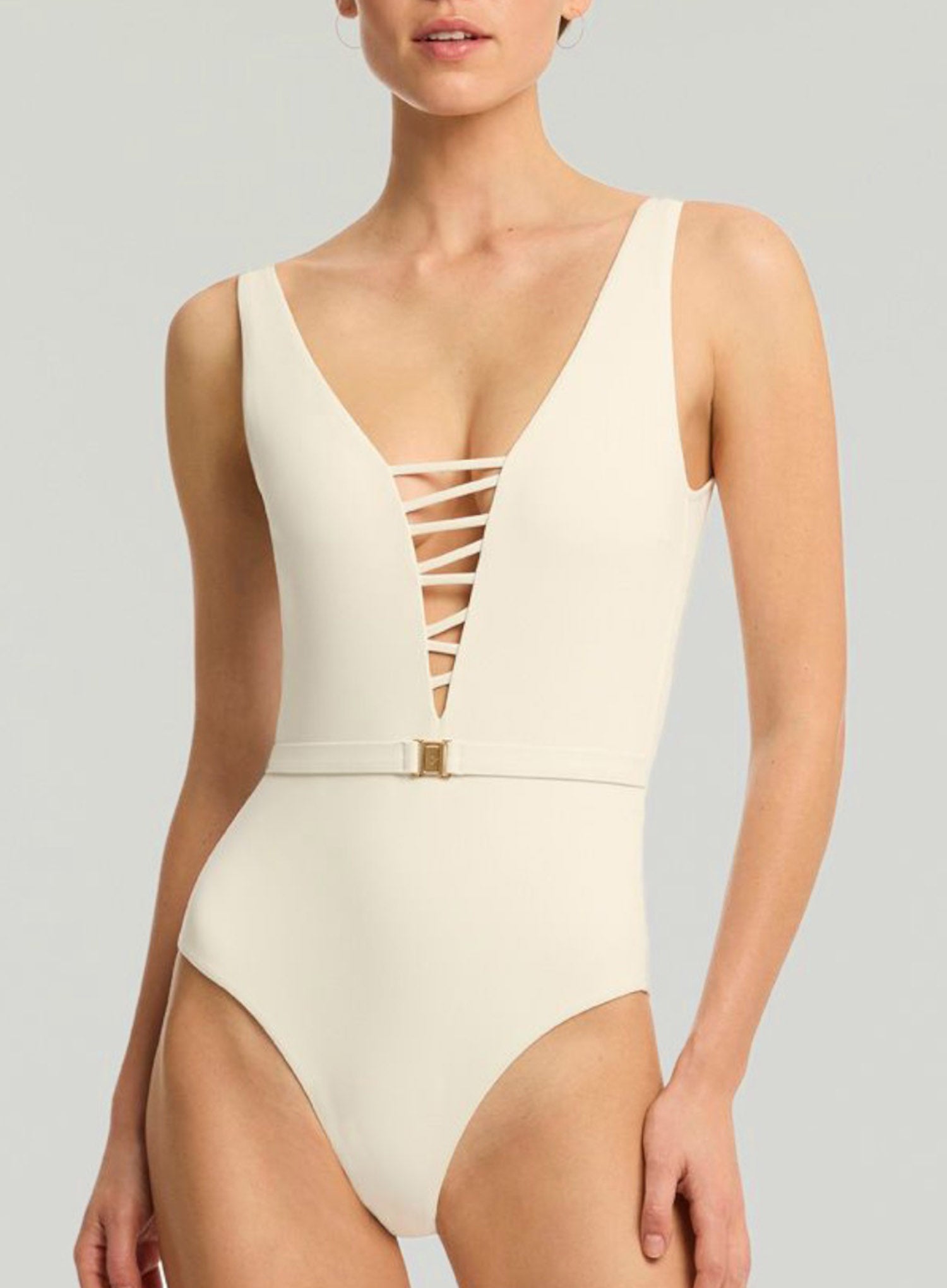 SEA LEVEL Lattice One Piece in Coconut is made to turn heads and exude elegance this summer. This sophisticated swimsuit offers a deep plunge neckline with striking lattice detailing, perfect for those seeking both style and comfort. Wire-free and crafted for a smooth fit, it includes removable cups to provide flexibility and support for A-DD bust sizes. The piece is accented by a chic belt with gold hardware, adding a touch of luxury while enhancing your silhouette. With moderate bottom coverage, this one-piece is ideal for poolside lounging or a day at the beach.
