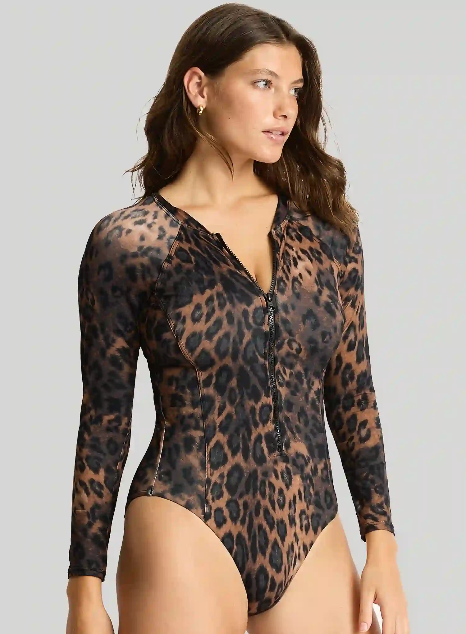 Inside, a supportive bra sheath with removable cups ensures you feel secure without wires, while powermesh panels shape and smooth. In a rich cocoa leopard print, this surf suit proves protective swimwear can be chic. Perfect for active holidays or poolside lounging, it’s both stylish and practical.