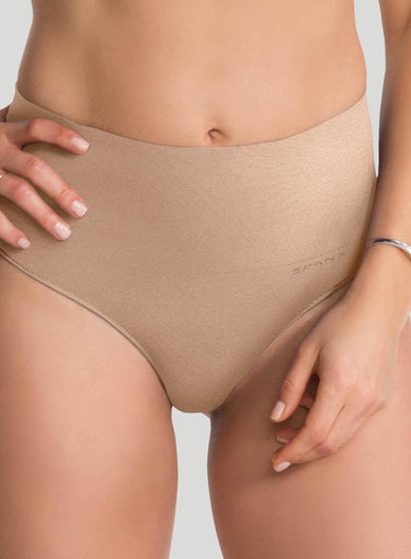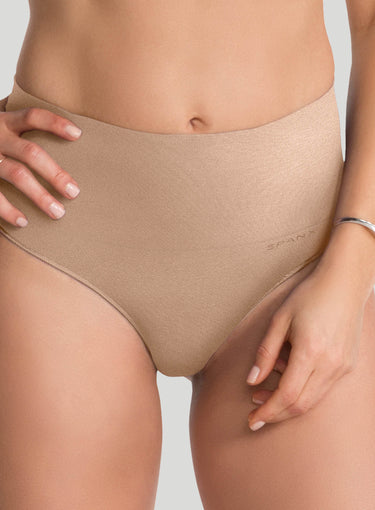 SPANX Everyday Shaping Thong in Nude are made with a soft Nylon, and Spandex/Elastane fabric that is breathable and comfortable to wear. You'll forget you're wearing them and help you look and feel great. The soft, seamless fabric shapes your hips for a smooth, sleek silhouette.