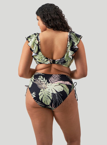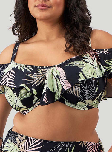 ELOMI SWIM Tropical Retreat Bikini Top Frill Black is our truly versatile new collection in our most loved shape, the perfect beachside look year-round. Escape to paradise and relax under lush botanicals with soothing sage and khaki greens, beautifully accented by soft blush pink on a black background. Cut from lightweight, chlorine resistant fabric, this design offers a fun and flirty approach to swimwear. Based on our bestselling Essentials Plunge Bikini Top by Elomi, this piece is designed to give you all the same support an Elomi bra does.