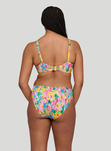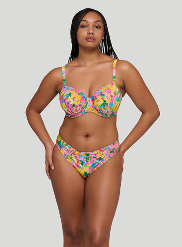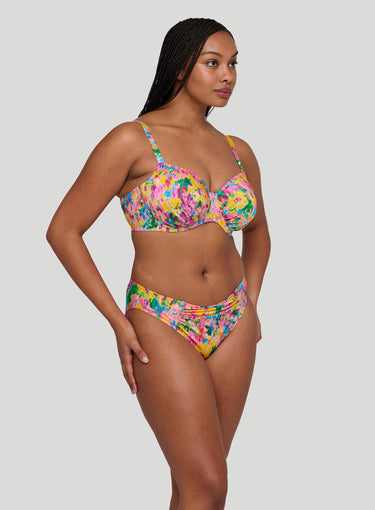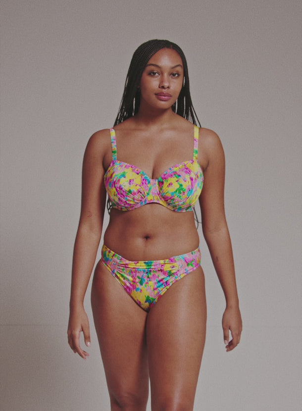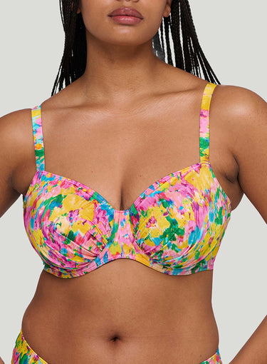 PRIMADONNA SWIMWEAR Ubud Full Cup Bikini Top  Sun Glowis a standout in this season's hero collection, showcasing a vibrant watercolor floral print in hot pink, yellow, green, and light blue for a romantic yet abstract vibe. Fans of past favorites like Najac and Kea will adore Ubud, with its pleated fabric adding a chic 3D effect and bold dimension. This painted flower design is a runway-inspired trend that’s stealing the spotlight. The three-piece cup designs work to lift and centre the breast for an even and rounded silhouette, while also providing great coverage. The added feature of drawstrings allows you to adjust the cups so you always have the perfect fit. Stand out with the style you love and the support you deserve.