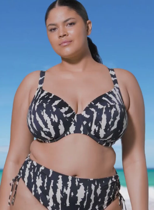 ELOMI Echo Shell Underwired Plunge Bikini Top in Black brings a modern twist to swimwear with its striking black-and-cream linear print. Designed on Elomi’s bestselling plunge shape, it features a low centre front for a flattering neckline without push-up and fully lined cups for support that feels just like your favourite lingerie.