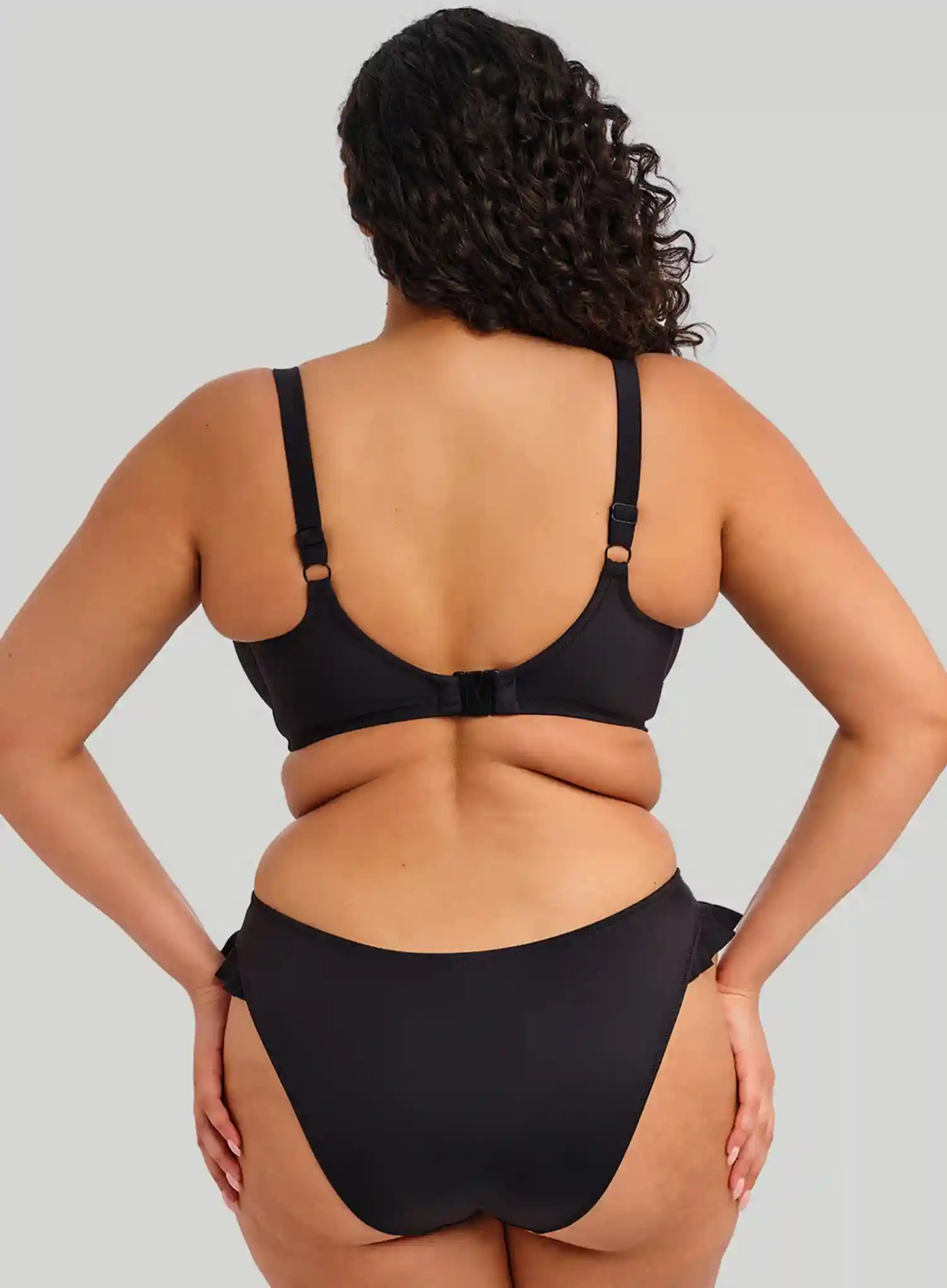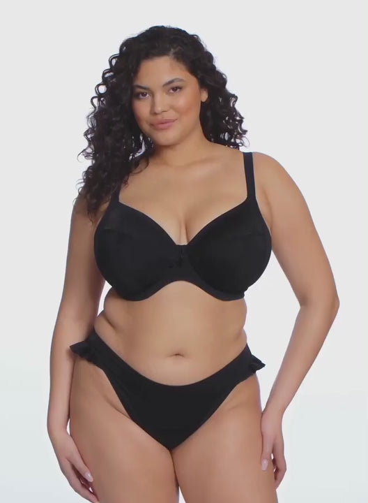 ELOMI SWIM Plain Sailing Underwired Plunge Bikini Top in Black. DeBra’s loves the range’s new Bikini Top, which features a concealed elastic neckline, powernet back lining, and a centre front tie detail. Bra-sized to ensure proper support and shaping. Fully lined with a light but supportive fabric, the Plain Sailing Underwired Plunge Bikini Top is in high demand.