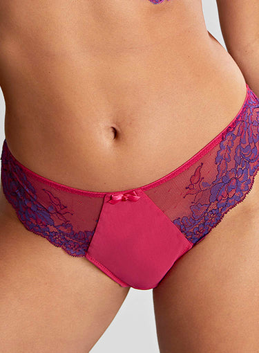 PANACHE Ana Thong in Orchid Indigo is a new and exciting take on an all-time bestseller, now in a show-stopping dual tone effect, featuring deep Indigo embroidery on a vibrant orchid base. Ana features a stretch lace front with a modesty panel and a smooth lace back with a non-visible panty line. Complete your Ana set today. This colour is available for a limited time only.
