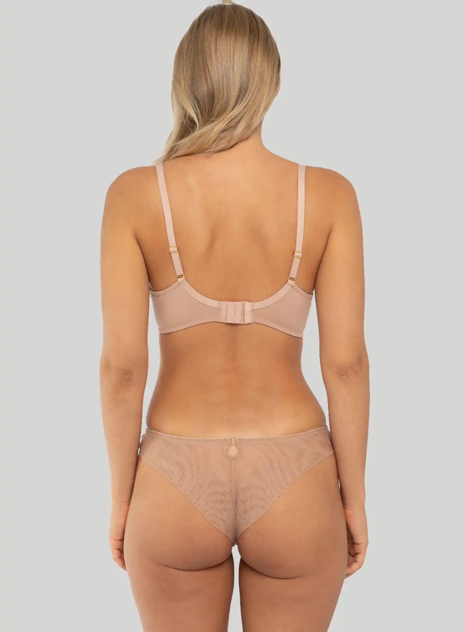 SAMANTA Perla Thong in Cappuccino is a flattering tanga style that combines mid coverage with delicate design details. The front features exquisite Swiss embroidery in an ornamental motif that creates a tattoo effect on the skin, contrasted with a seamless back for a smooth, invisible finish under clothing.