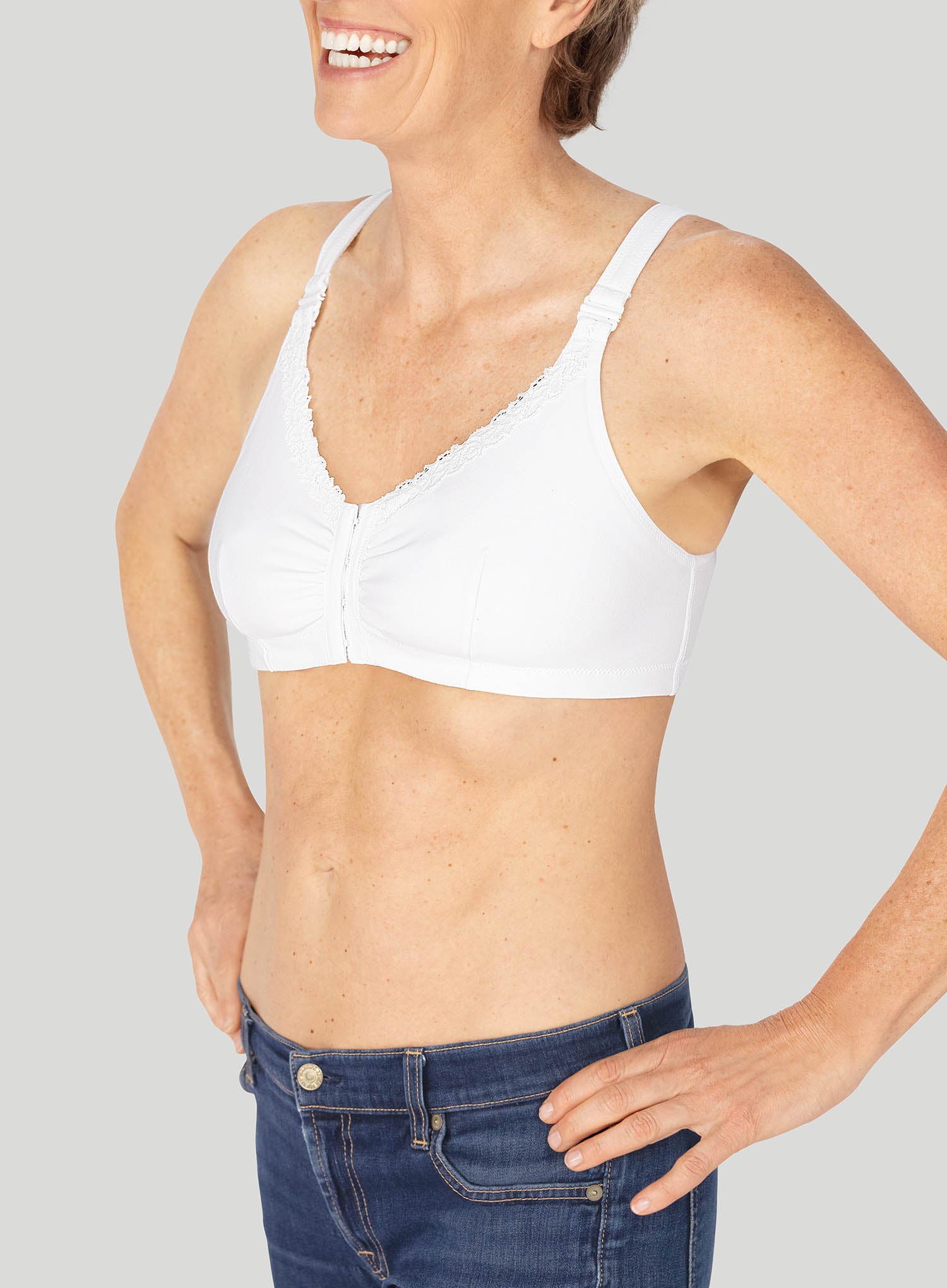 AMOENA Hannah Front Opening is the ultimate in super soft and non-restrictive. This post surgery bra is front opening and closing for easy access during treatment. Not only is it non-restrictive, it also features sewn cotton pockets and smooth interior seams to not irritate sensitive areas. The lace lining also adds a beautiful feminine touch not usually found in post-surgery bras.