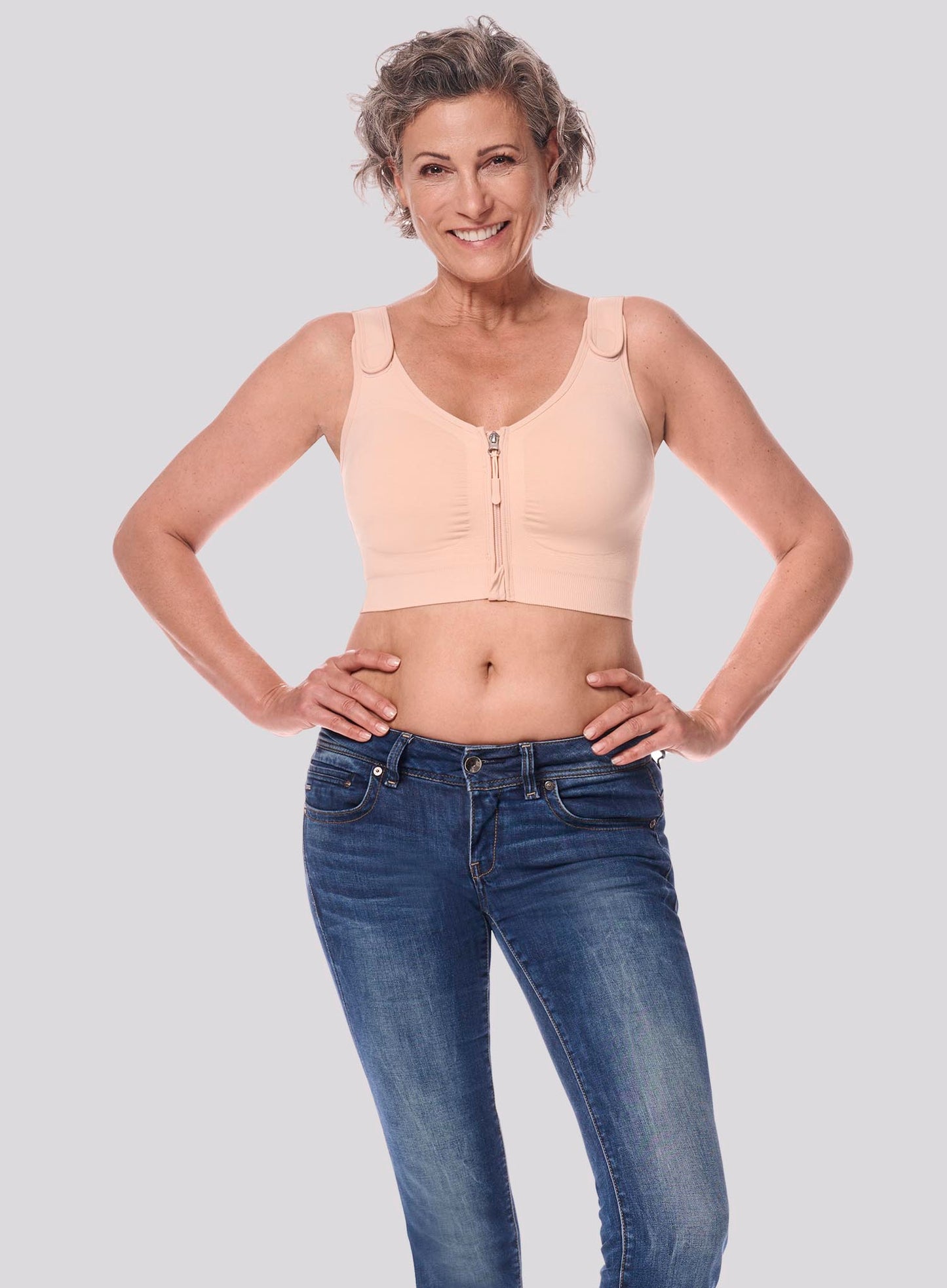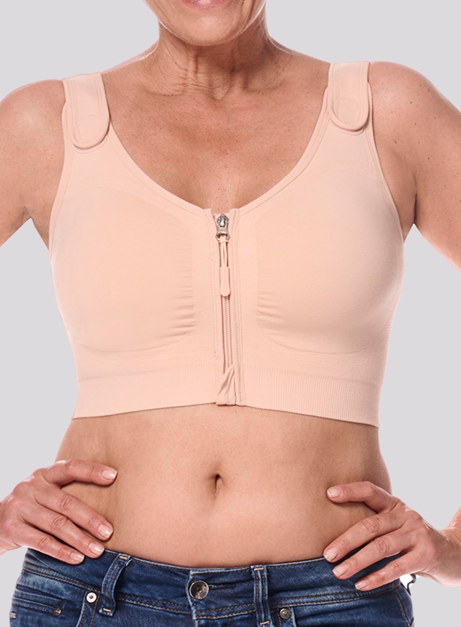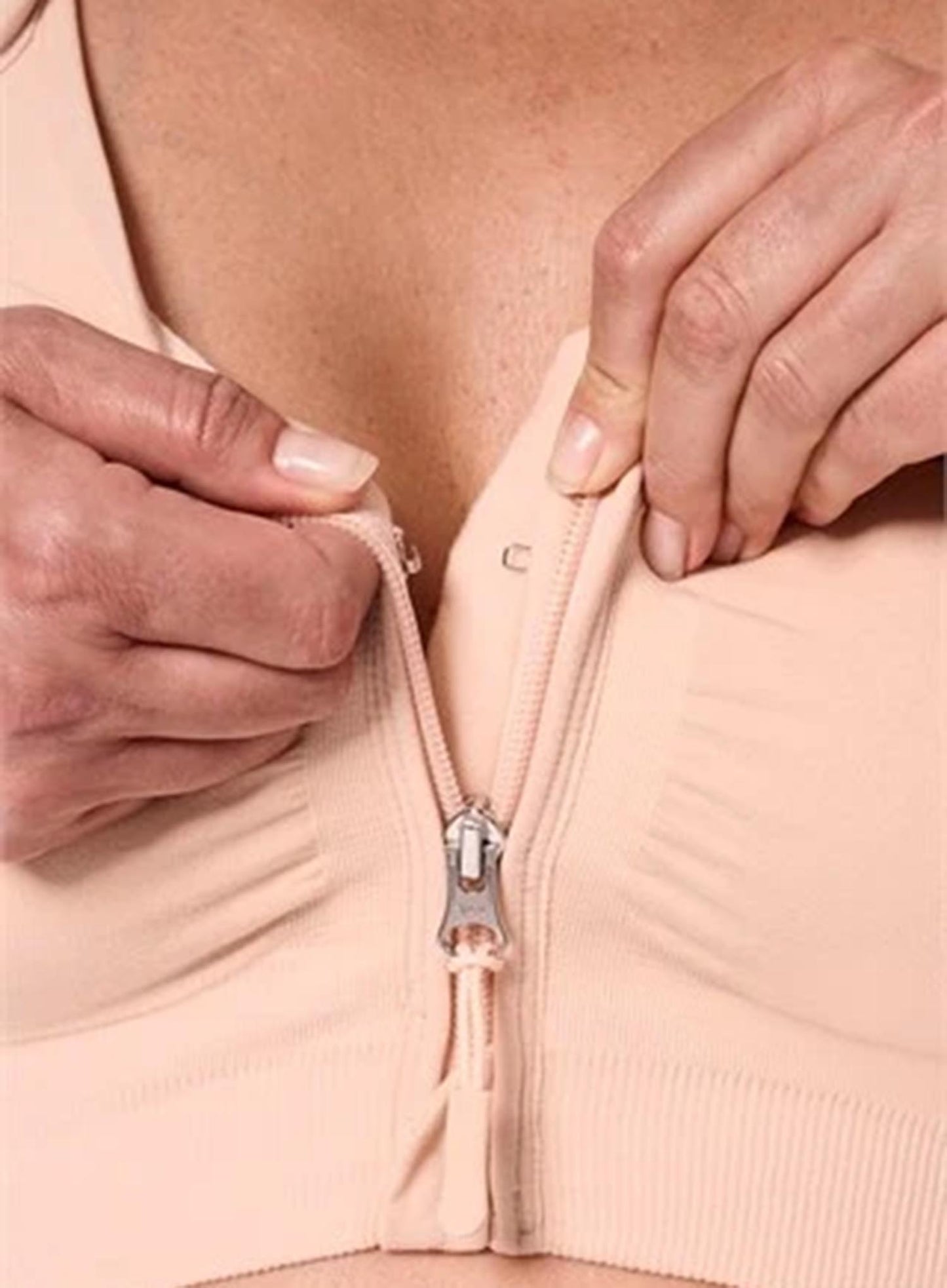 AMOENA Leyla Post-Surgery Seamless Compression Bra Rose Nude offers low compression with unparalleled comfort and support for immediate post-surgical recovery. Pre-washed and ready for clinical use, this bra features seamless technology for a precise, adaptive fit that accommodates individual breast sizes and shapes. Its unique design provides ring-shaped compression in the upper breast area while excluding the cup area, ensuring gentle support. A front zip closure with hooks and eyes underneath adds security and ease of use, while seamless pockets can hold a Priform or Leisure Form. The Leyla Bra is thoughtfully designed for all-day comfort and functionality, making it ideal for various post-surgical needs.