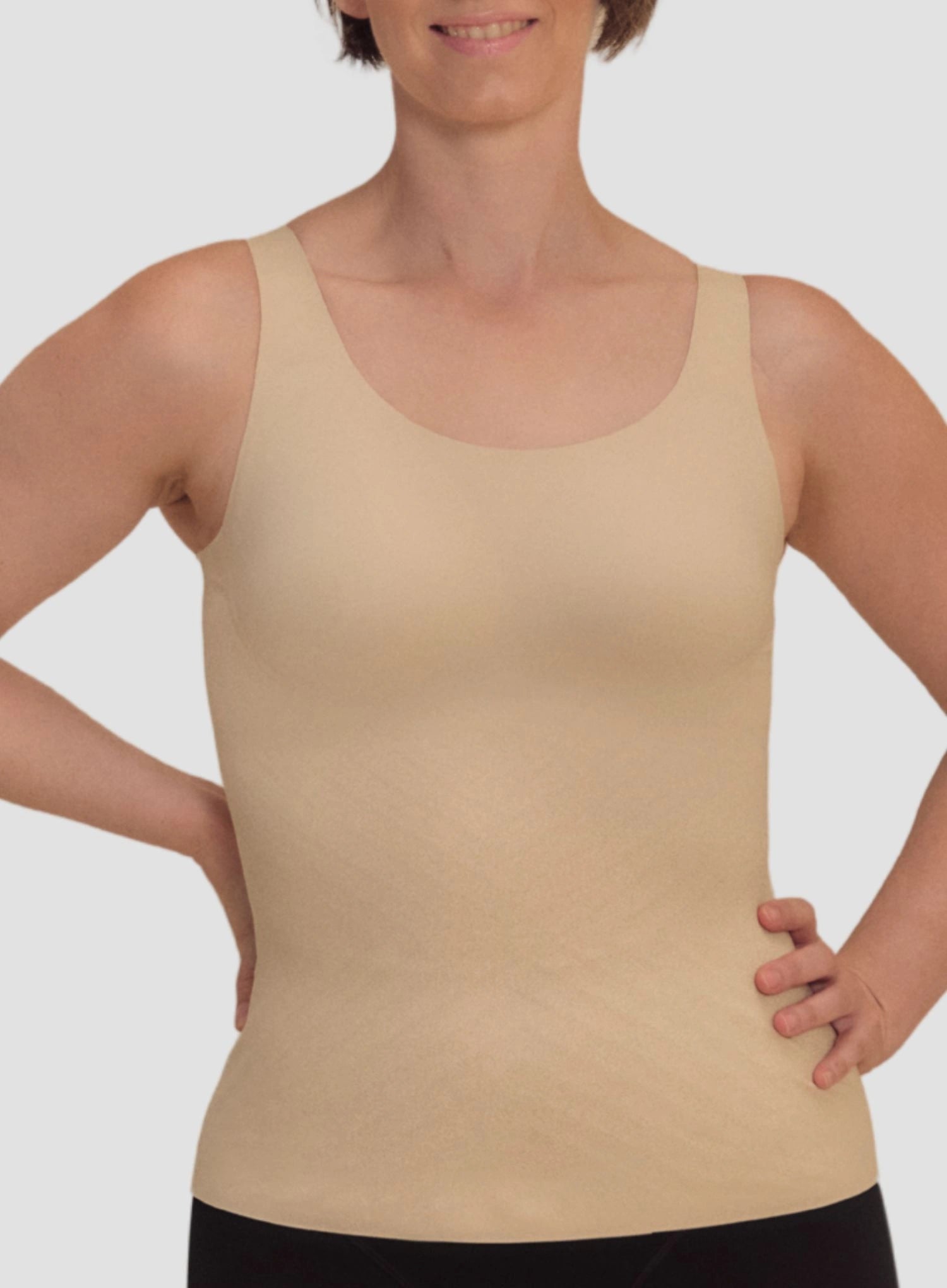 AMOENA Linda Top in Sand is thoughtfully designed for post-surgery wear and sensitive skin. Soft, smooth fabric ensures comfort while wide straps and gentle closures prevent digging or irritation. Integrated pockets securely hold breast forms or shapers in place, allowing freedom of movement and confidence throughout the day. Lightweight padding conceals unevenness, and the overall fit supports natural shape without pressure.