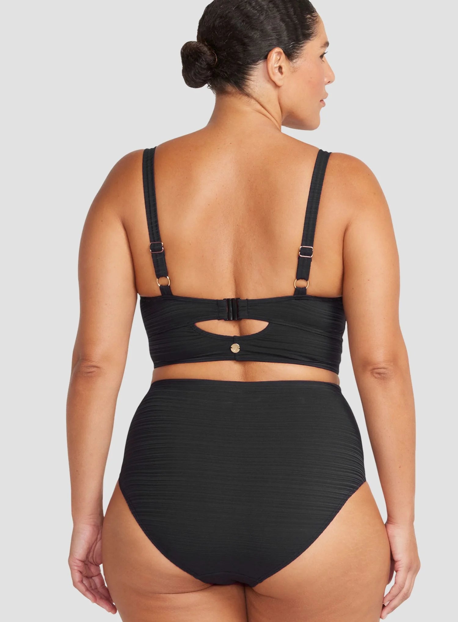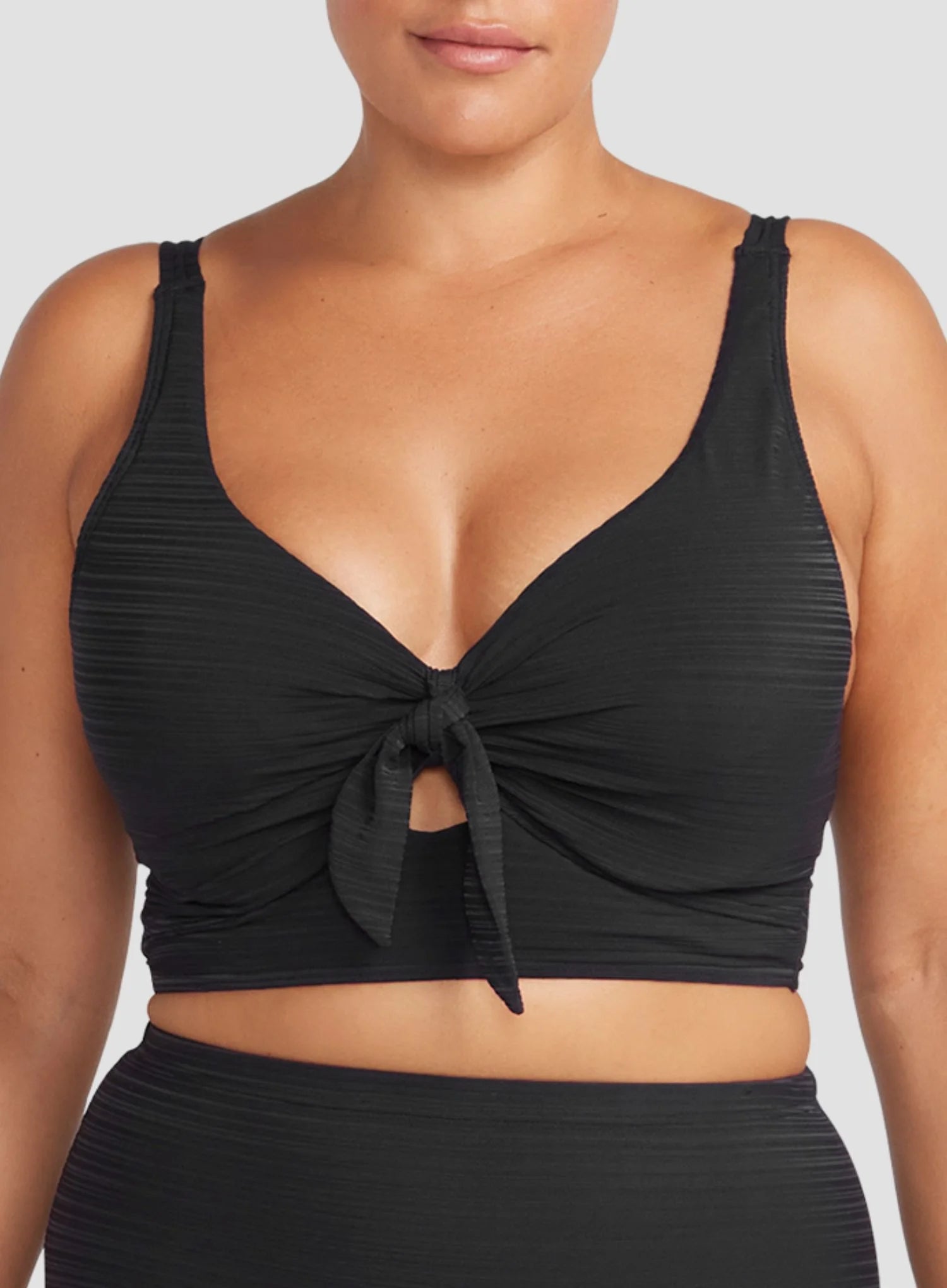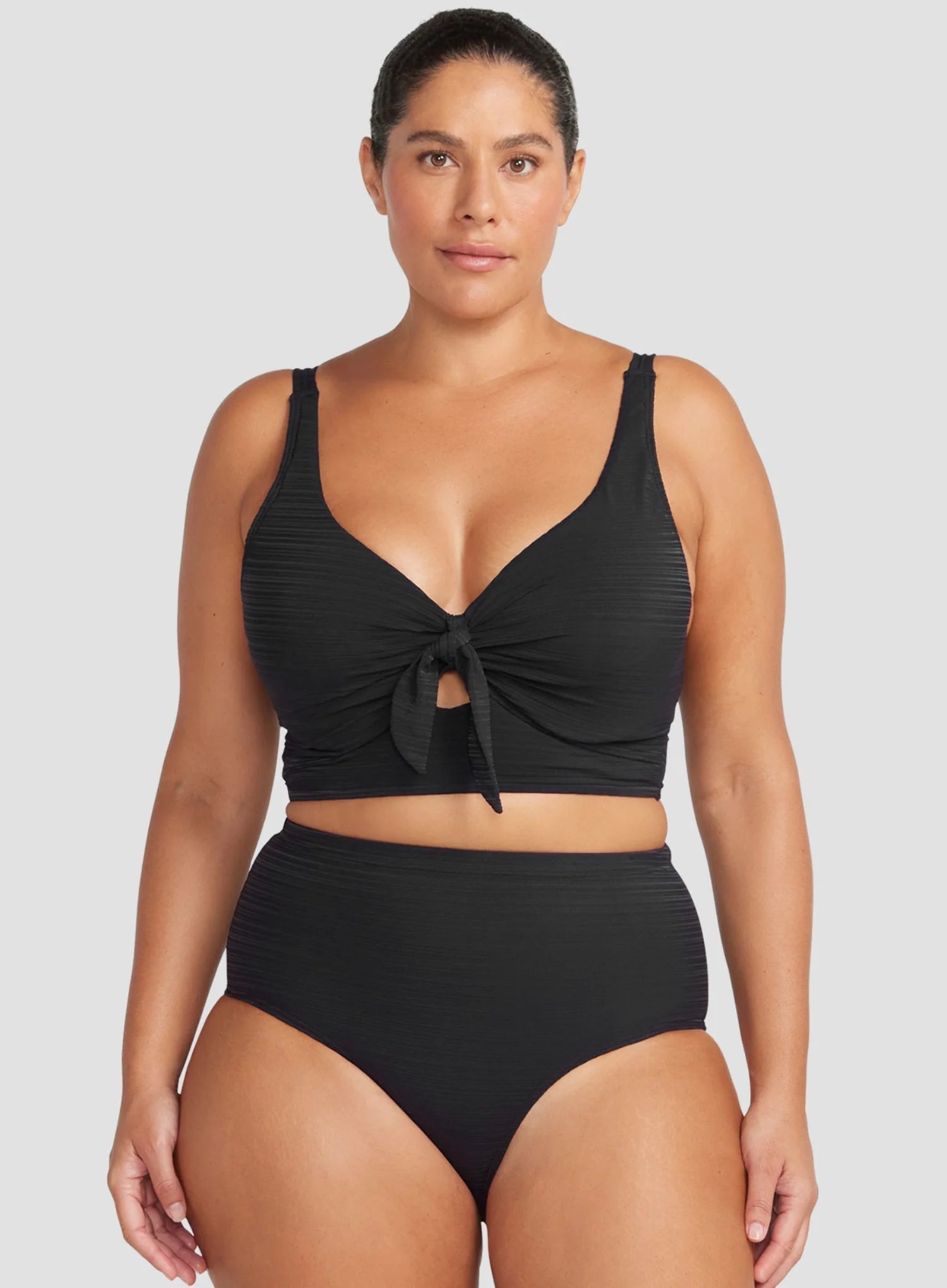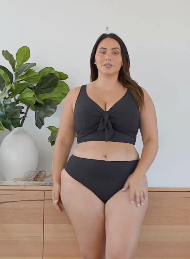 ARTESANDS Aria Cezanne Underwired Midriff Bikini Top in Black combines luxurious texture with body-sculpting confidence. The midriff-length silhouette features full foam cups with underwire support, tailored for D–E cup sizes, providing lift and shaping. A mock knot tie at the centre front enhances the bust line, creating a flattering hourglass effect, while adjustable straps and a secure back clip allow for a personalised fit. The longer-line design adds coverage and sophistication, making this bikini top stylish and functional for curvy figures.