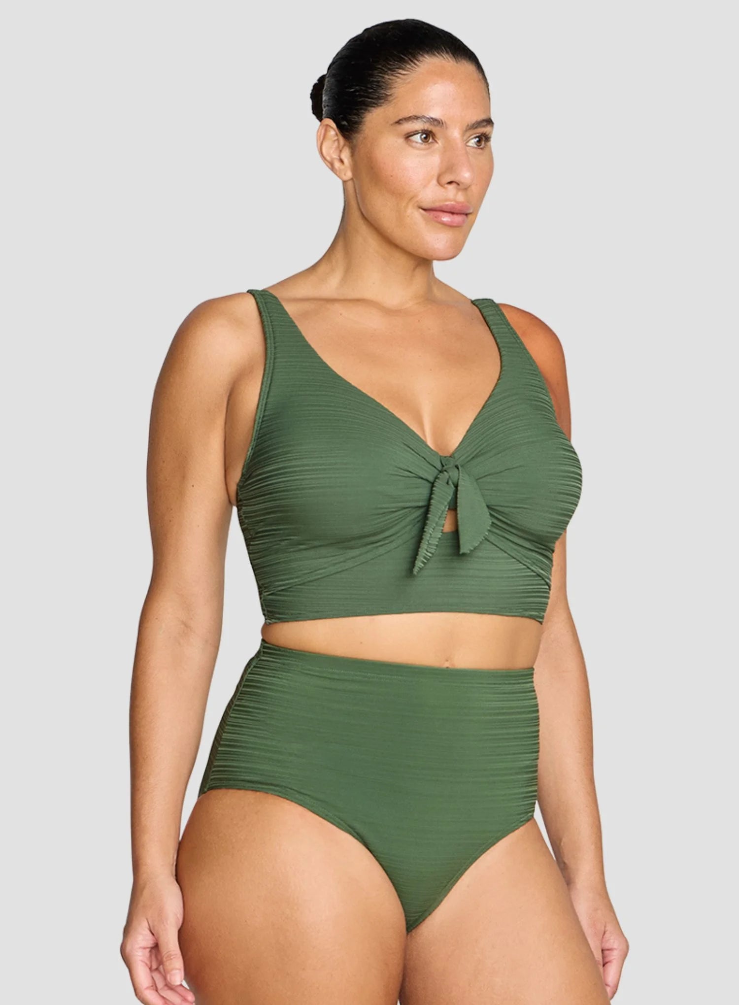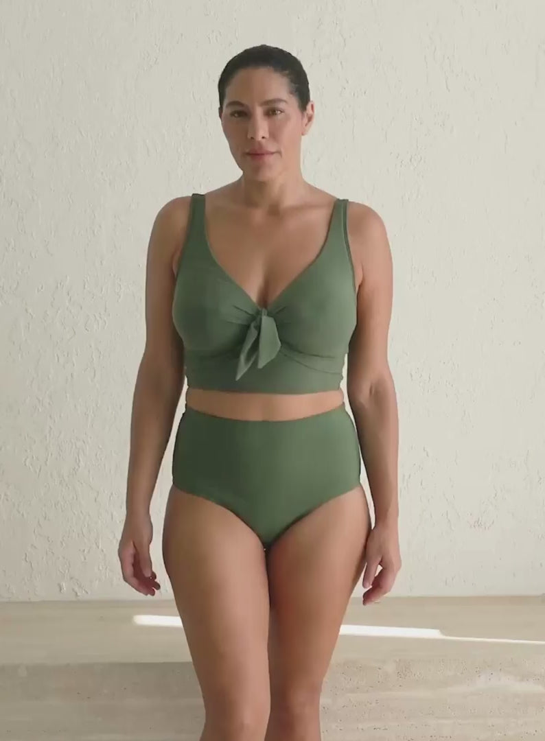 ARTESANDS Aria Cezanne Underwired Midriff Bikini Top in Olive blends textured elegance with functional support. Full foam cups with underwire lift and shape D–E busts, while a mock knot tie at the centre front accentuates the silhouette. Midriff-length coverage and adjustable straps make this top secure and versatile, combining comfort with a flirty, sophisticated look. Its longer-line design ensures flattering coverage without compromising style, perfect for curvy figures.