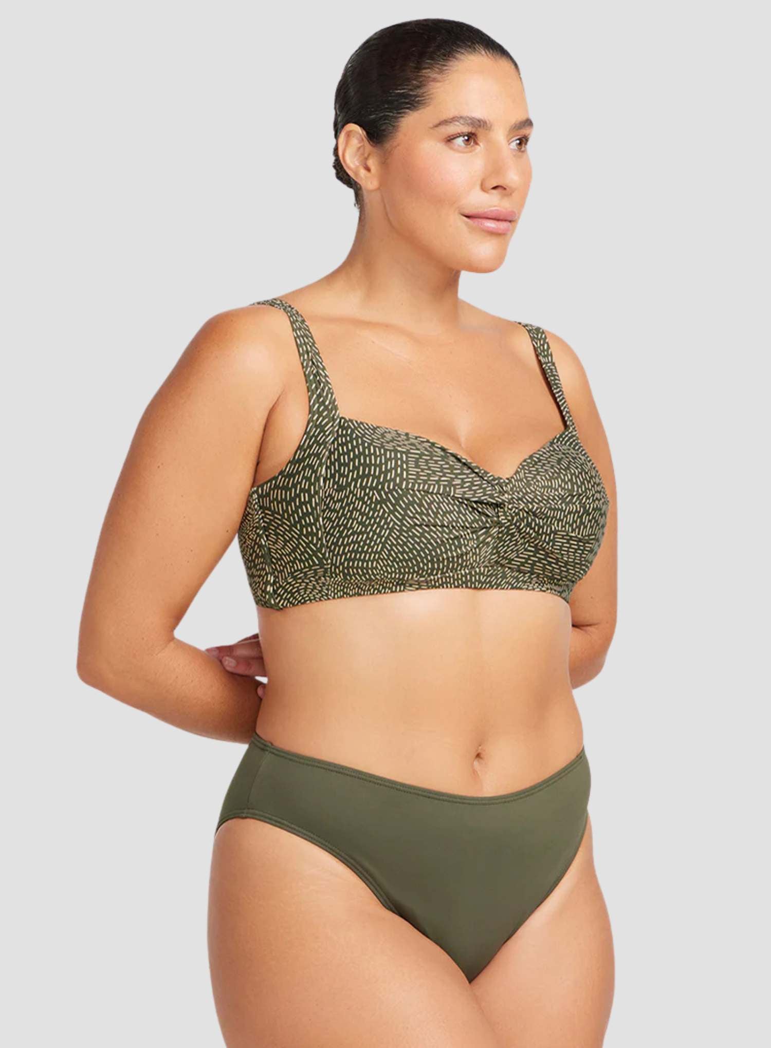 ARTESANDS Hues Delacroix Basic Swim Pant Olive is designed for effortless comfort and a sleek, flattering fit. With a classic basic-rise cut, this curve-fit swim bottom sits comfortably on the waist while providing gentle shaping through its full-body lining. Crafted from soft-touch, high-stretch swim fabric, it moves with your body, offering support and flexibility without feeling restrictive. Tailored for curvy figures, this swim pant enhances natural curves while providing a smooth, streamlined silhouette. Whether paired with a tankini or bikini top, it’s the perfect versatile piece for a comfortable, confident swimwear look.