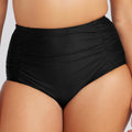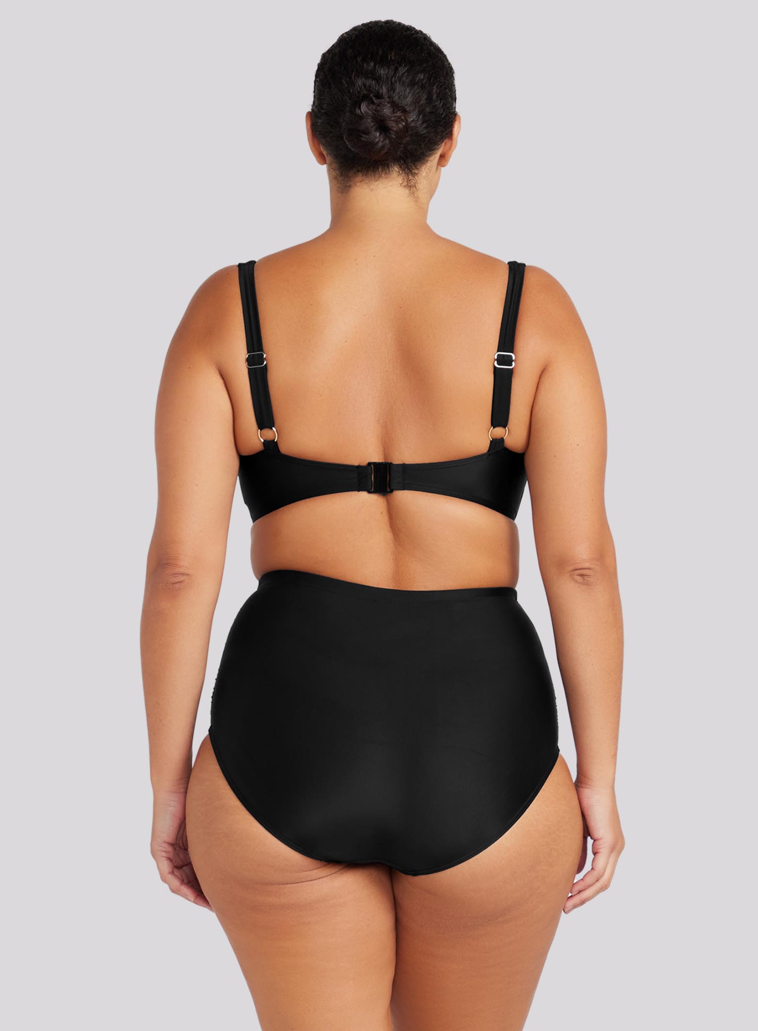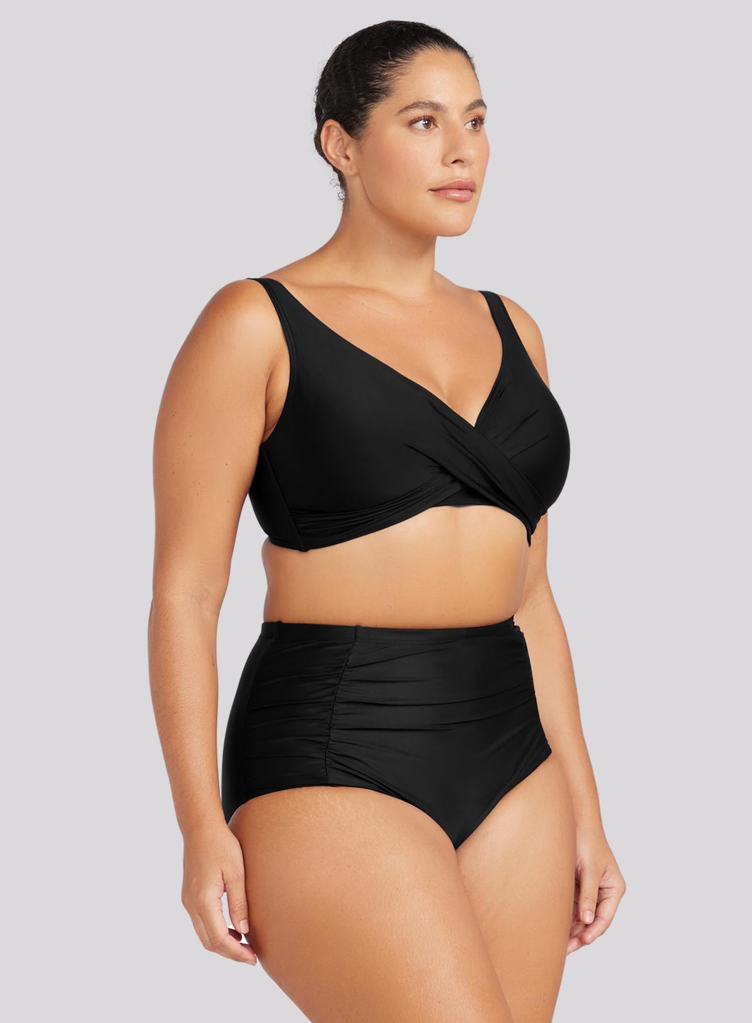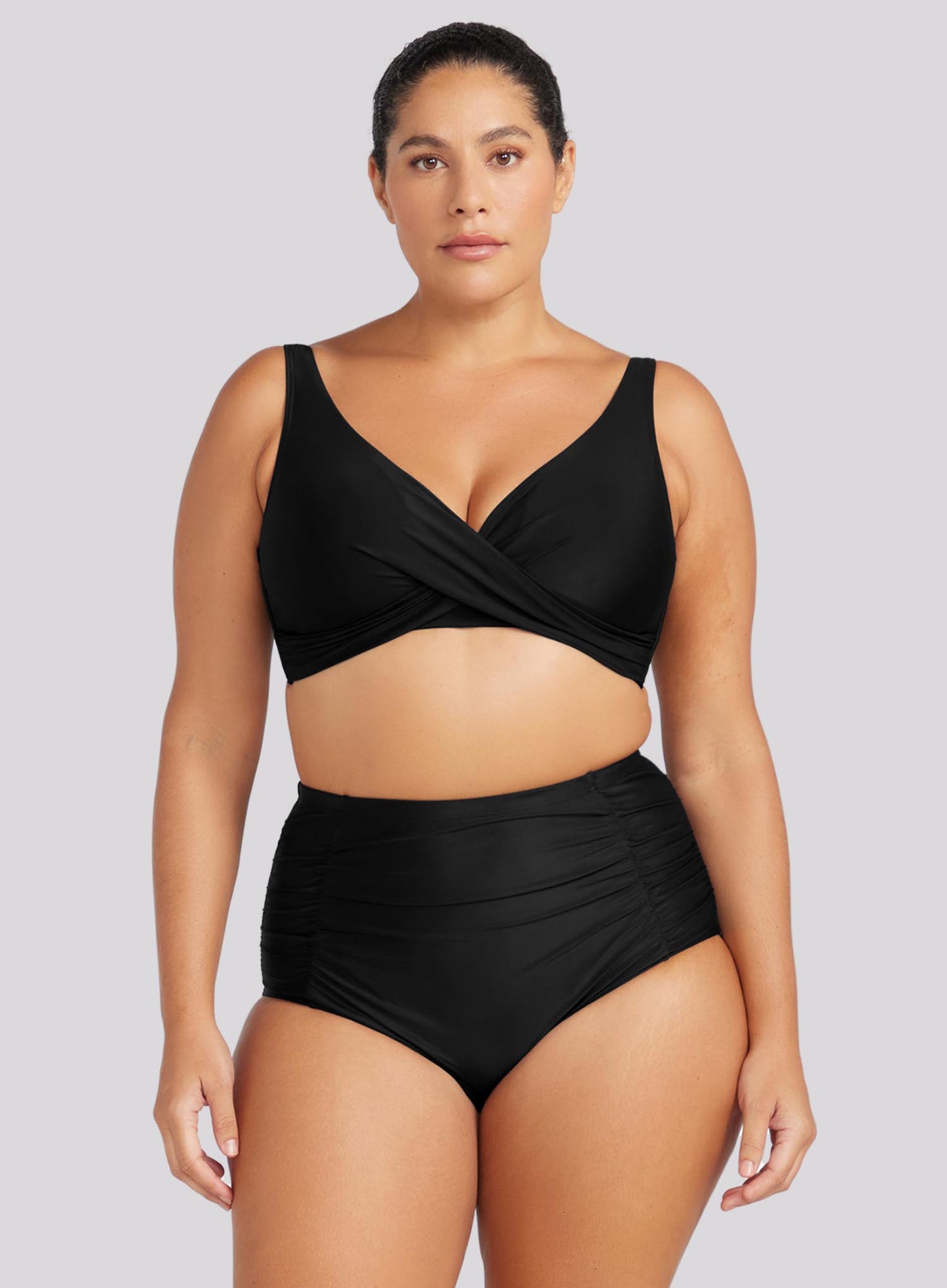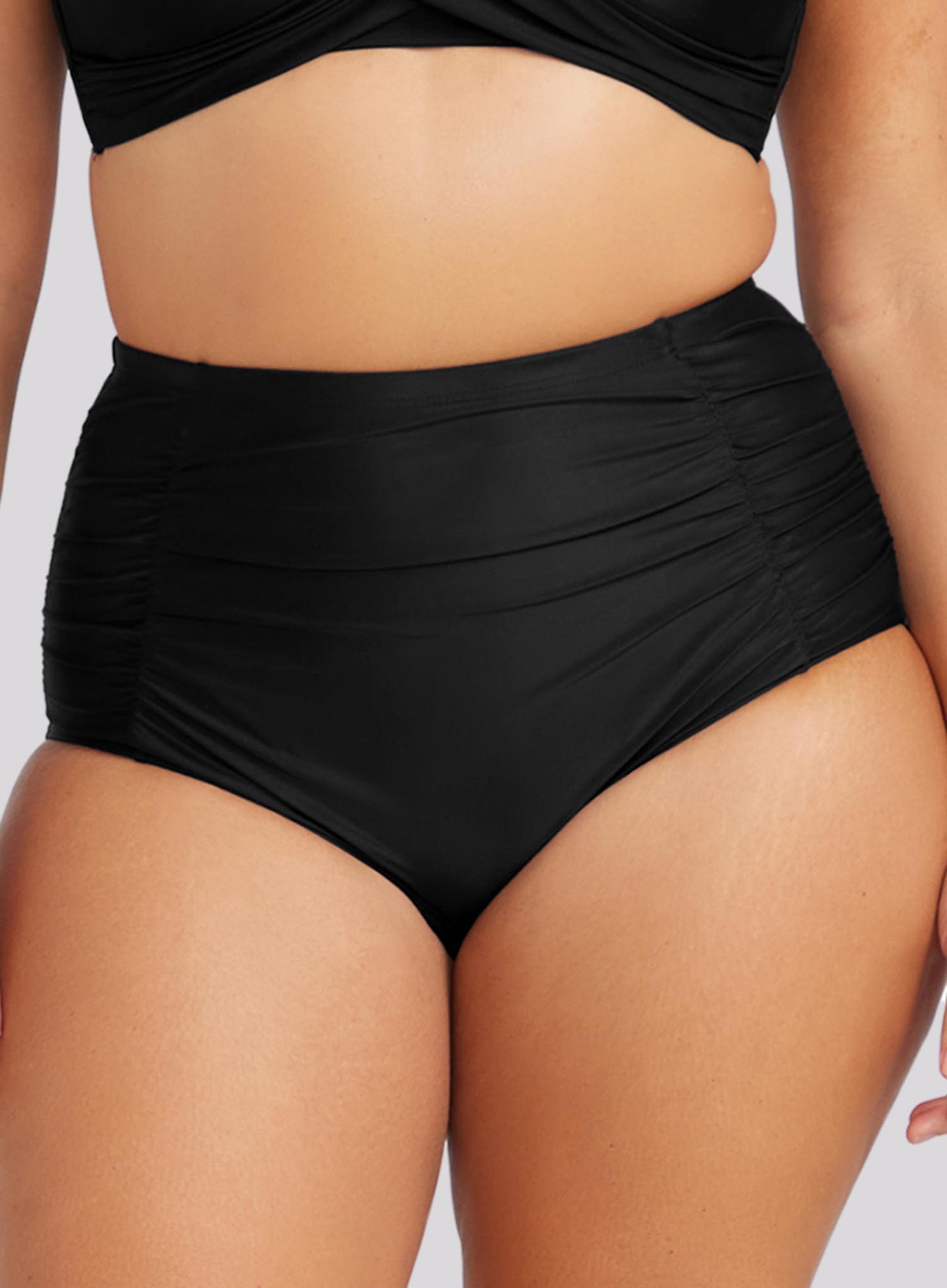 ARTESANDS Hues Raphael High Waist Rouched Swim Pant Black is the go-to swim bottom for curvy figures. Featuring a high-waisted cut with a low leg line, this style offers full coverage while enhancing and smoothing the silhouette. The double front ruching, along with powermesh lining at the front and back, creates a flattering, sculpted effect, helping to shape and support where needed. Made from luxuriously soft, high-stretch swim fabric, it ensures both comfort and flexibility for all-day wear. Designed to complement tankini or bikini tops, this pant provides a seamless, confidence-boosting fit, perfect for those who love a classic, full-coverage swim look.