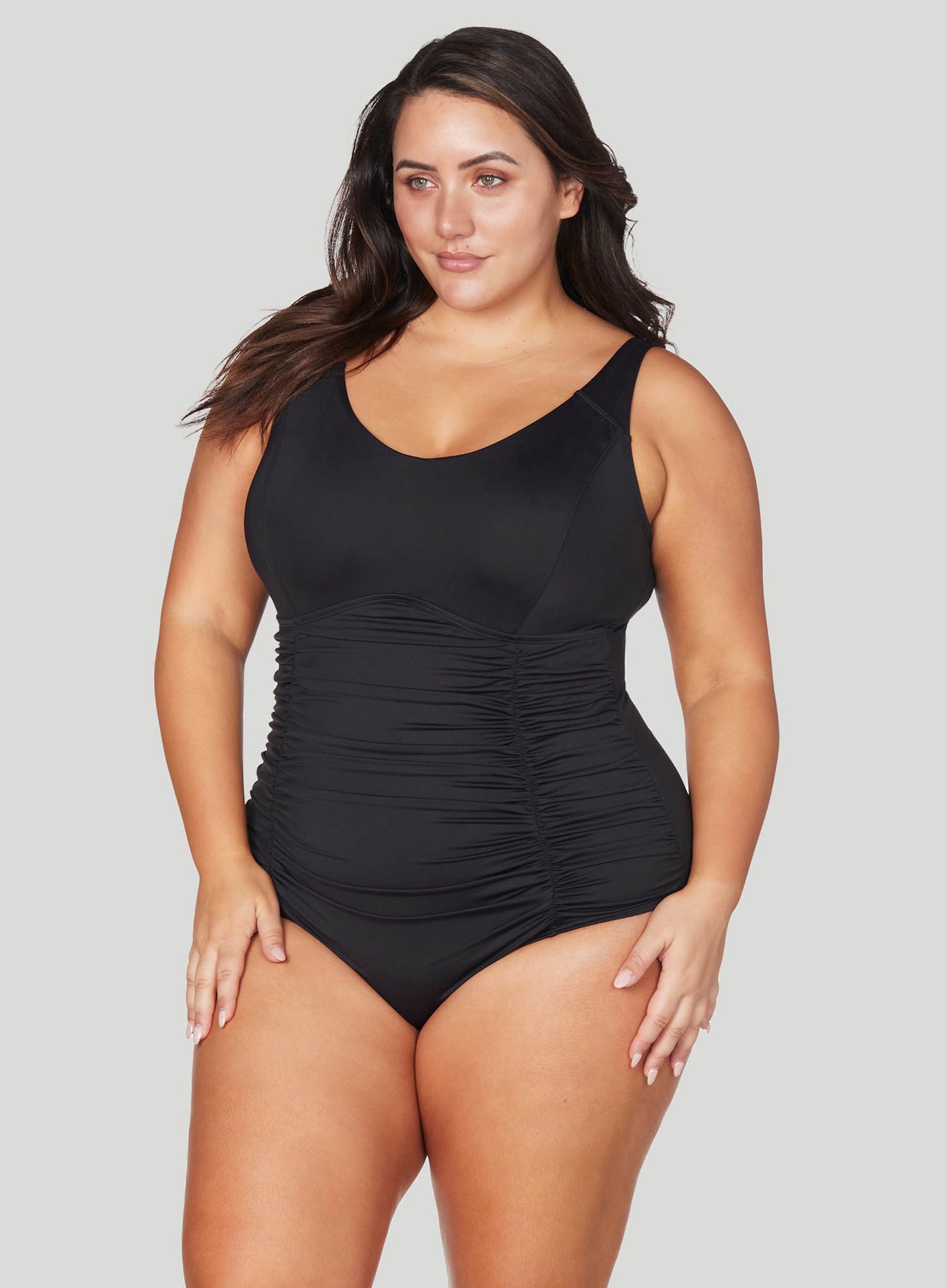 ARTESANDS. Hues Raphael Underwire One-Piece Swimsuit comes with all the bells and whistles and is best suited for the curvy lady who prefers a full-support style swimsuit. Presenting a completely hidden internal shelf bra with underwire support, a modest front neckline, lower leg lines for greater coverage, and shoulder straps that give you the option to cross the straps over and clip them into place for maximum support.