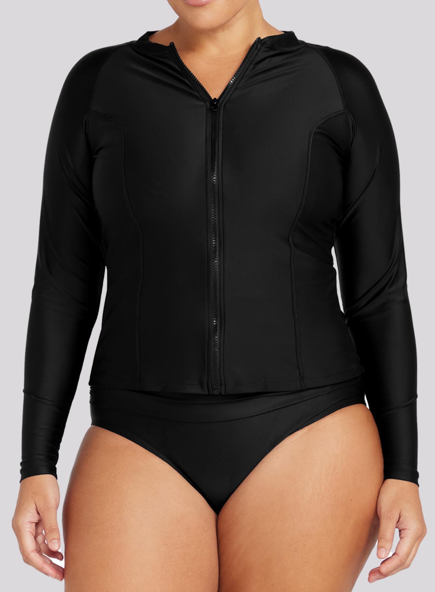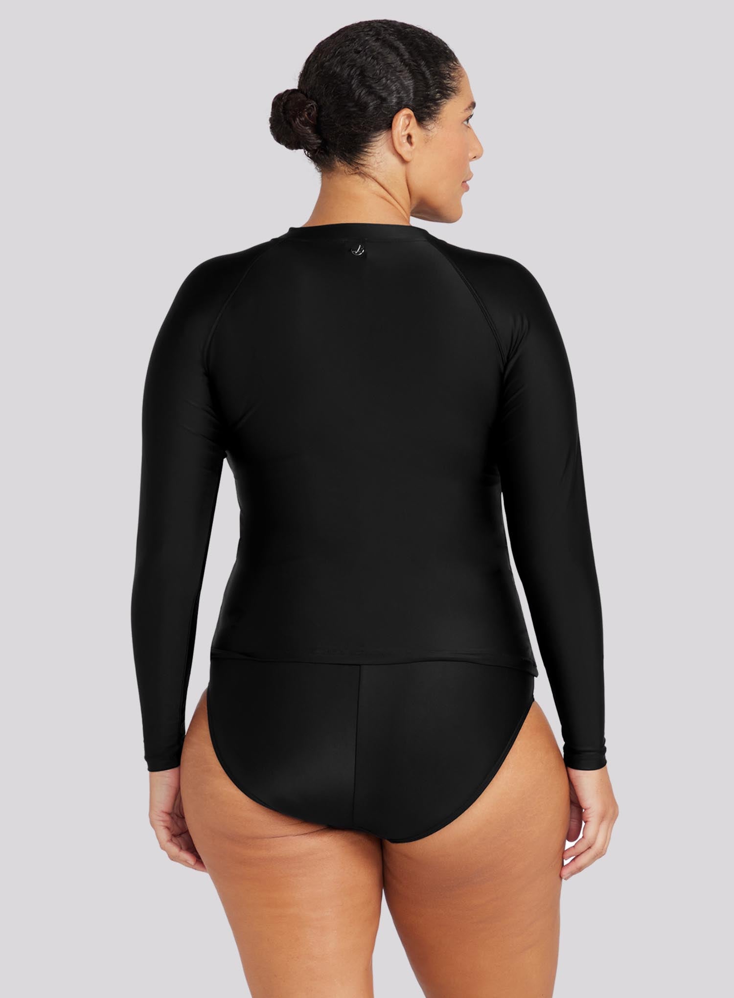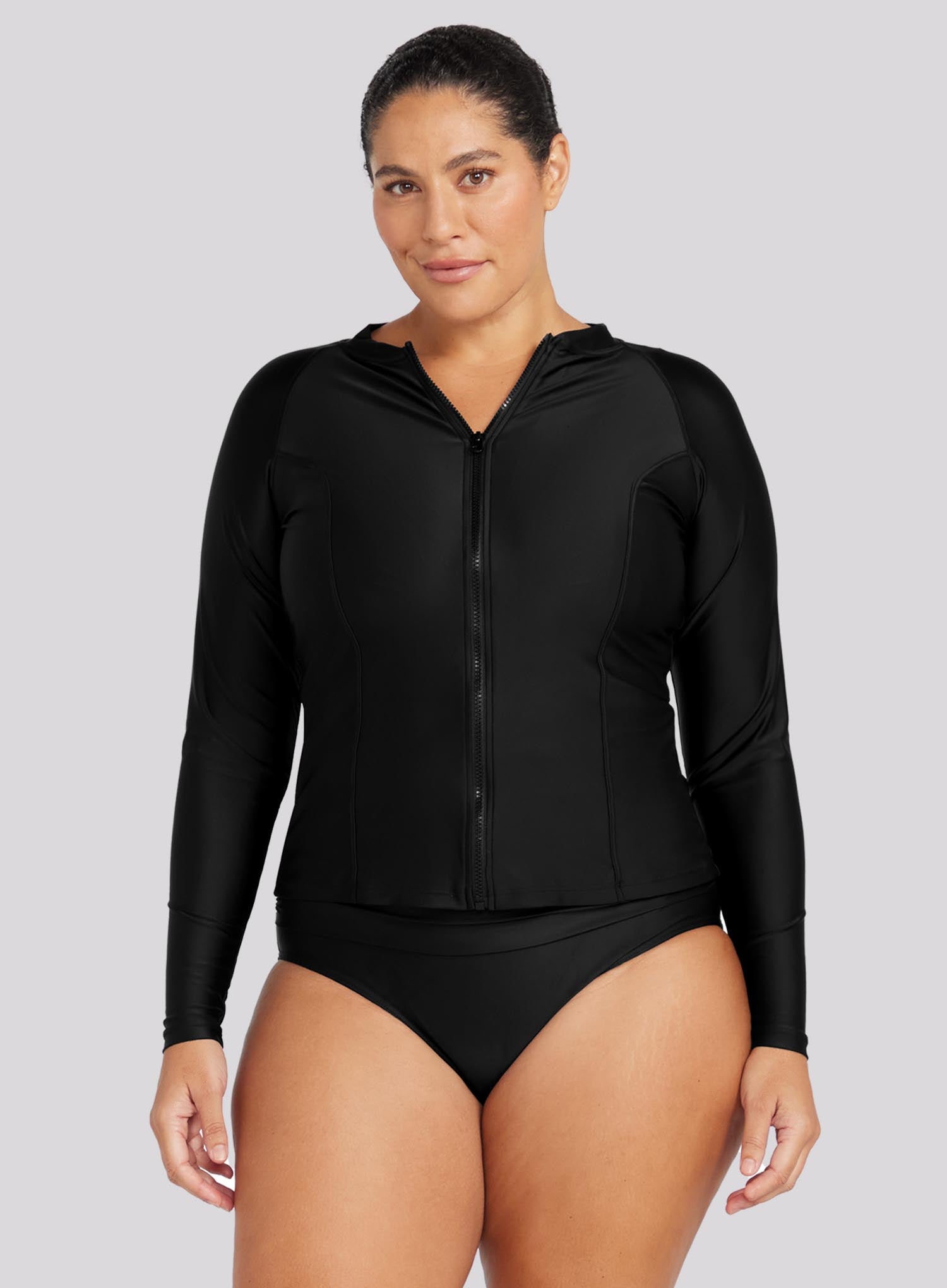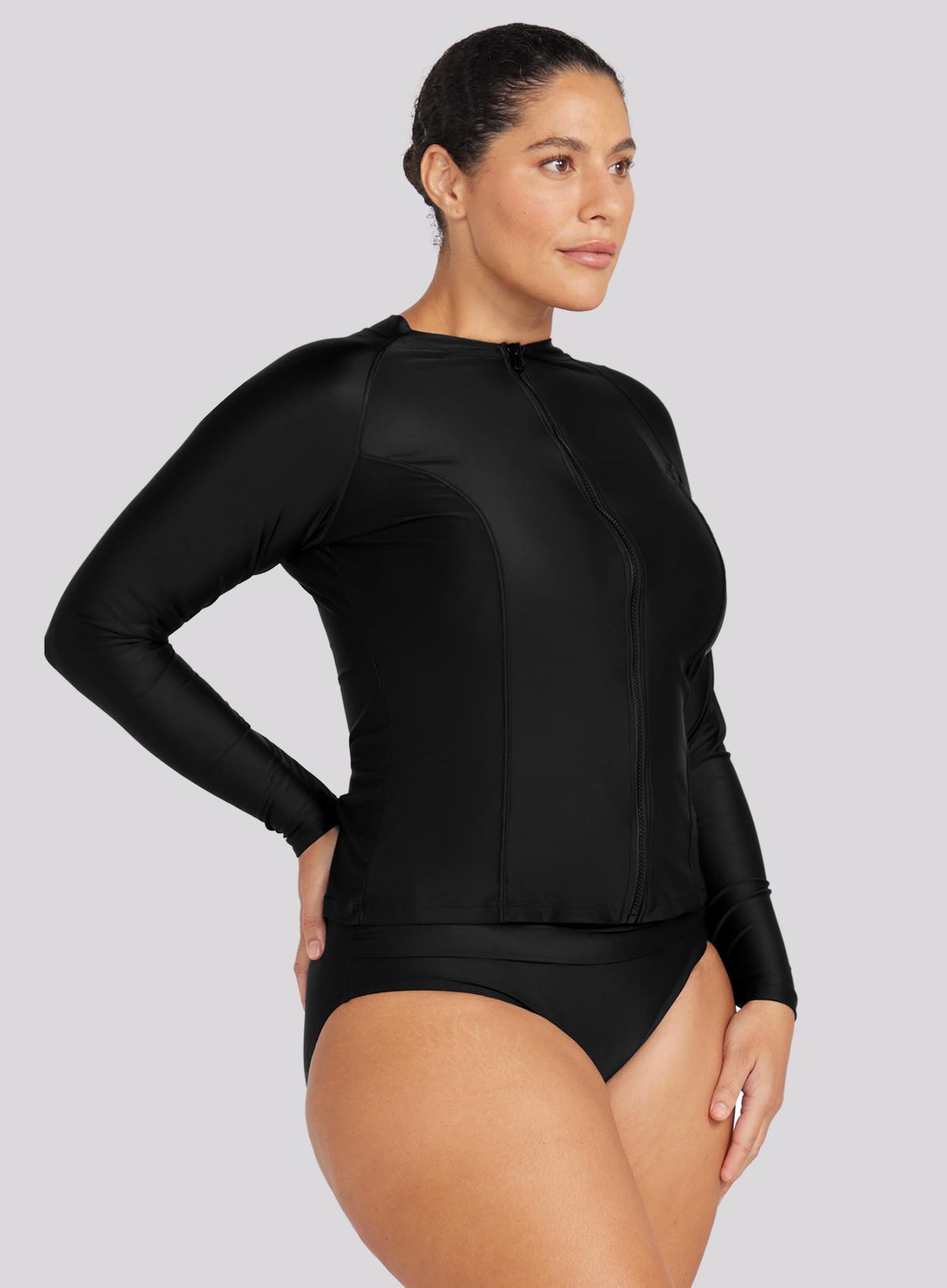 ARTESANDS Hues Seurat Sunsafe Long Sleeve Top Black is a beachside essential for ultimate sun protection with a sleek, sculpting fit. Crafted with UPF 50+ sun-safe fabric, this rash guard shields your skin while offering a curve-enhancing silhouette with strategically placed side panels. The full-length front zipper provides adjustable coverage and effortless wear, secured with a lockable function to stay in place. Designed with a raglan sleeve cut, it ensures unrestricted movement, making it ideal for swimming, water sports, or all-day beach lounging. The longer sleeves offer maximum coverage while maintaining a breathable, lightweight feel. Perfect for layering over your favorite swimwear, this long-sleeve rash top is the ultimate blend of sun safety, support, and sculpting comfort.