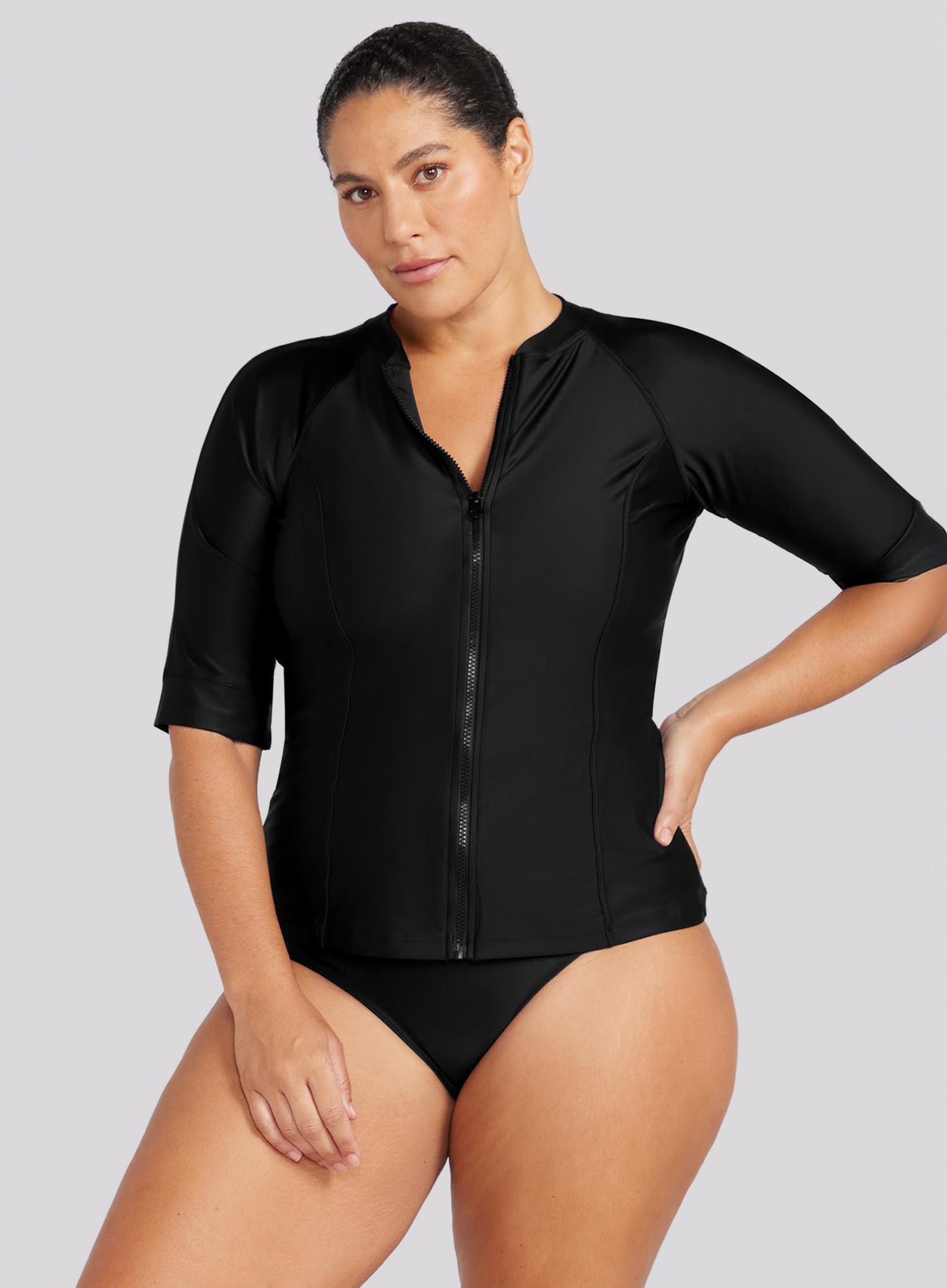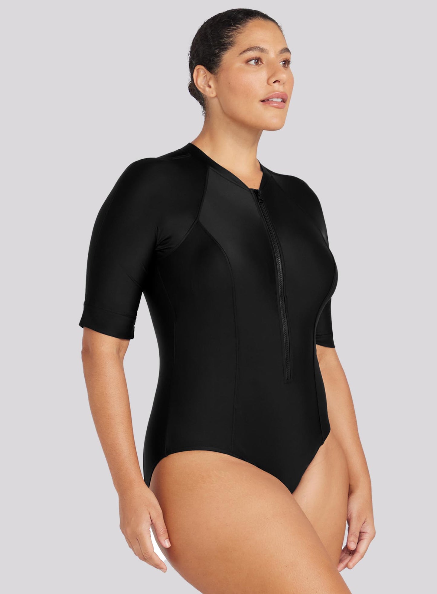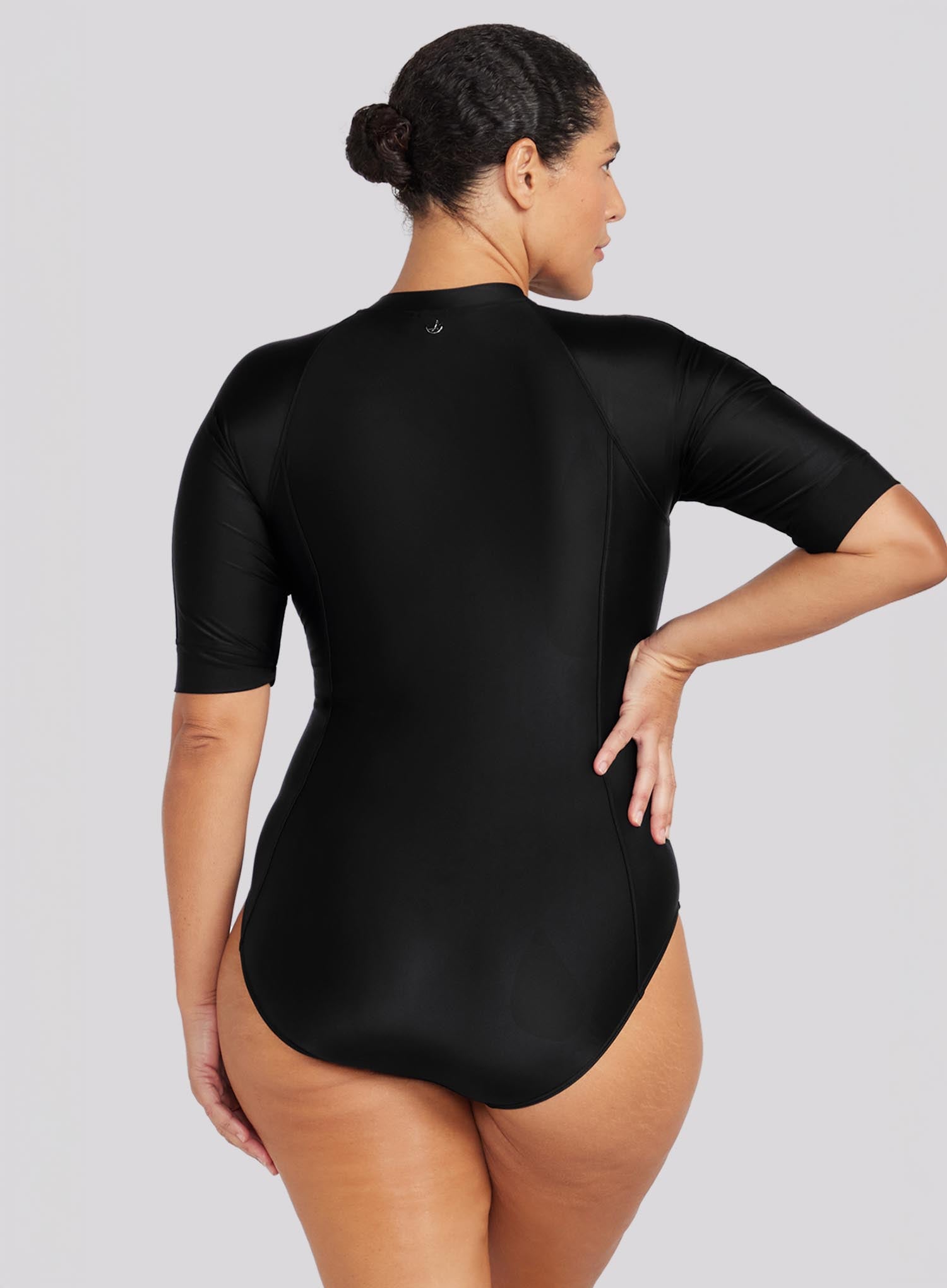 ARTESANDS Hues Sunsafe Short Sleeve Sun Suit Black is the ultimate swimwear choice for confident, curve-loving coverage. This one-piece swimsuit features mid-length sleeves and UPF 50+ fabrication, providing superior protection from the sun while maintaining a sleek, sculpted fit. Designed with multi-fit cups and a built-in front shelf bra, it offers hidden bust support for a smooth and secure feel. The clever panel design enhances natural curves, creating a flattering hourglass shape, while the front zip allows for easy dressing and adjustable coverage. Soft removable foam cups add versatility, making this sun suit customisable to your preference and allow for added volume. Whether you're enjoying a beach day or an active swim, this all-in-one piece ensures you feel supported, sculpted, and sun-safe.
