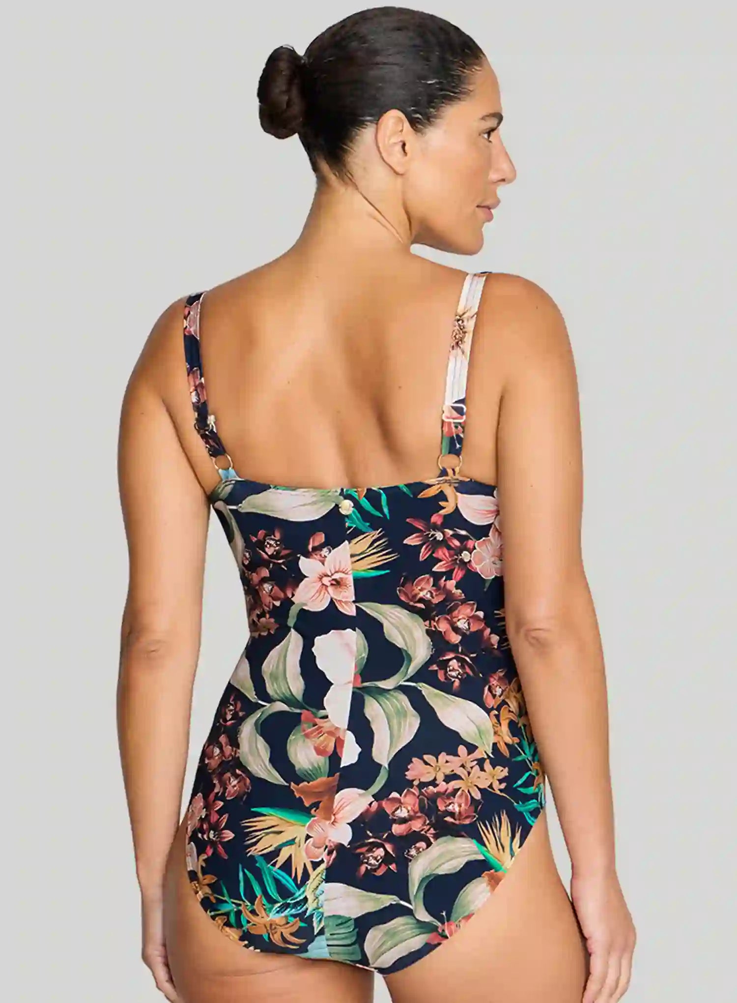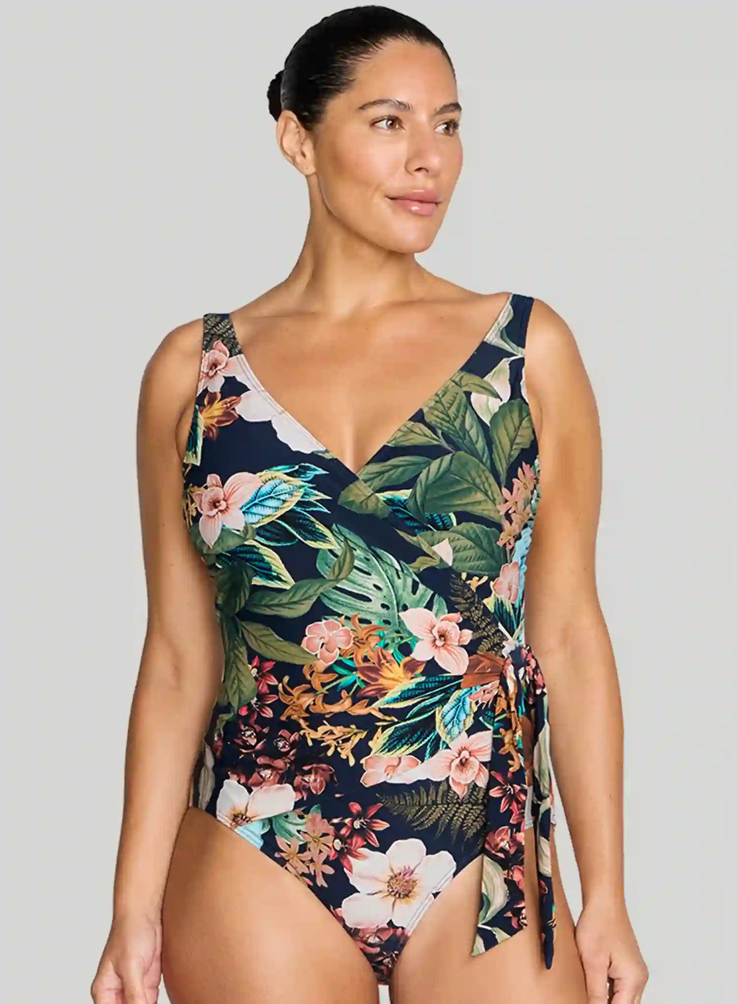 ARTESANDS Into The Saltu Hayes Underwire One Piece Navy is a beautifully sculpted swimsuit with a striking tropical print designed for support and style. Featuring a faux wrap design with a side tie to cinch the waist, Hayes enhances your natural curves with a hidden underwire shelf bra and soft removable foam cups.