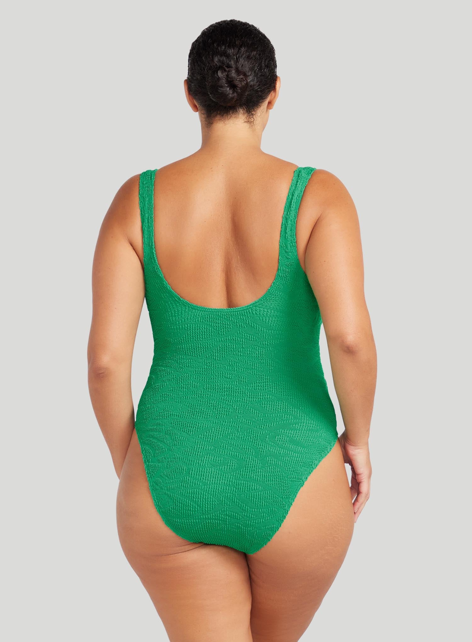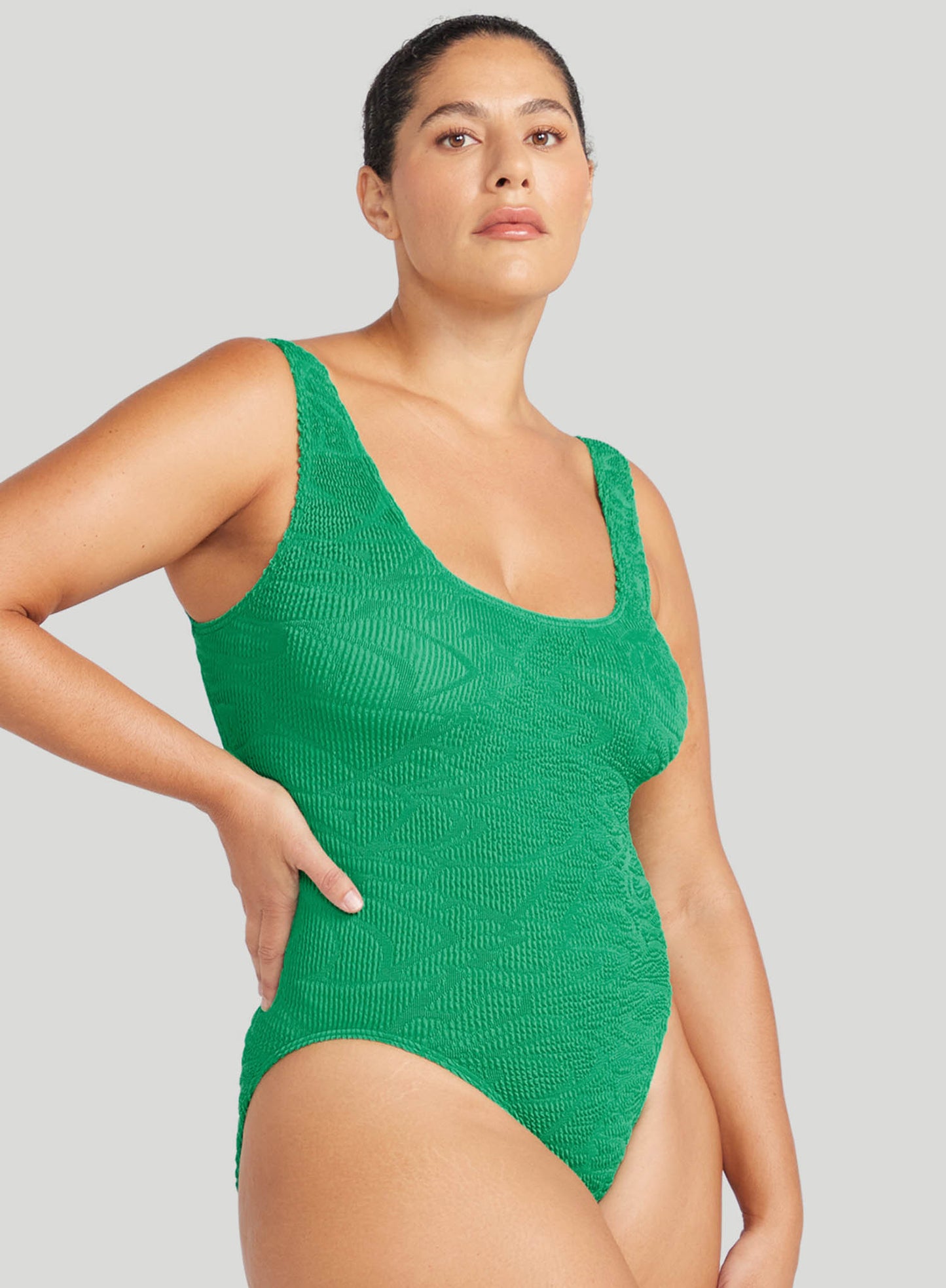 ARTESANDS Kahlo One Piece Green Geo is made to fit you, not the other way around. This bright green one-piece is crafted with a geo-inspired imprint in the fabric. This unique design is our high neck scoop back one piece in a sleek long line style with a low cut leg, designed to enhance your natural curves and provide the support you need. Our Kahlo collection is crafted from Artesands signature one-size crinkle fabrication, a body-hugging tubular knit that eliminates side seams and offers a smooth and seamless fit. The nylon material is incredibly stretchy, allowing the swimwear to mould perfectly to your body, fitting sizes from Australian 12- 22 effortlessly, providing comfort and confidence no matter how your body changes. Ethically designed and made in Australia, this one piece reflects our commitment to quality and sustainability. DeBra’s, we believe that every body is a swimwear body, and with our 'Kahlo', you'll feel empowered and beautiful, ready to embrace the sun!